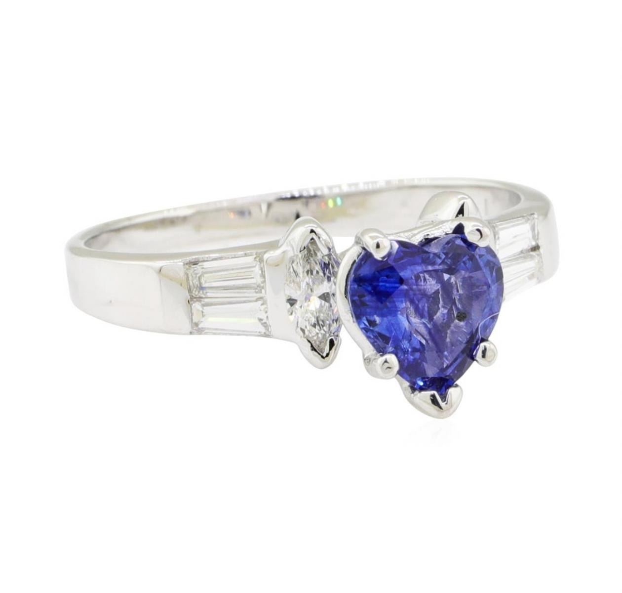 One electronically tested 14KT white gold lady's cast fashion ring with a heart shaped motif with a bright polish finish. The featured lady's ring has a shank measuring 1.70 millimeters wide. Identified with markings of '14K'. Condition is new, good workmanship. Containing: One prong set heart modified mixed cut natural blue sapphire, measuring 6.75 x 6.50 x 3.20mm, (depth est.) 10%. bulge factor, approximate weight of 1.23ct., clarity is eye clean, medium, moderately strong, blue color, (GIA B 5/4), cut is very good. Transmitting light with no distortion, transparent. Colored gemstones are presumed to have been subjected to commonly used enhancement processes. Graded in the setting. Two prong set marquise shaped cut diamonds, measuring 5.00 x 2.50 x 1.58mm (depth est.) approximate total weight of 2 Stones = 0.24ct. Graded in the setting. Color H - I Clarity VS-2 to SI-1 Cut Good Four channel set baguette cut (tapered) diamonds, measuring from 3.50 x 1.80 x 1.53mm (depth est.) to 3.60 x 2.00 x 1.70mm (depth est.) approximate total weight of 4 Stones = 0.40ct. Graded in the setting. Color G - H Clarity VS-1 to VS-2 Cut Very Good. Total Weight of Colored Stones 1.23ct.. Total Weight of Diamonds 0.64ct.. Total Weight of Ring 3.60gm GAS Appraised at $4460.00. GAS Appraised at $4,460.00.