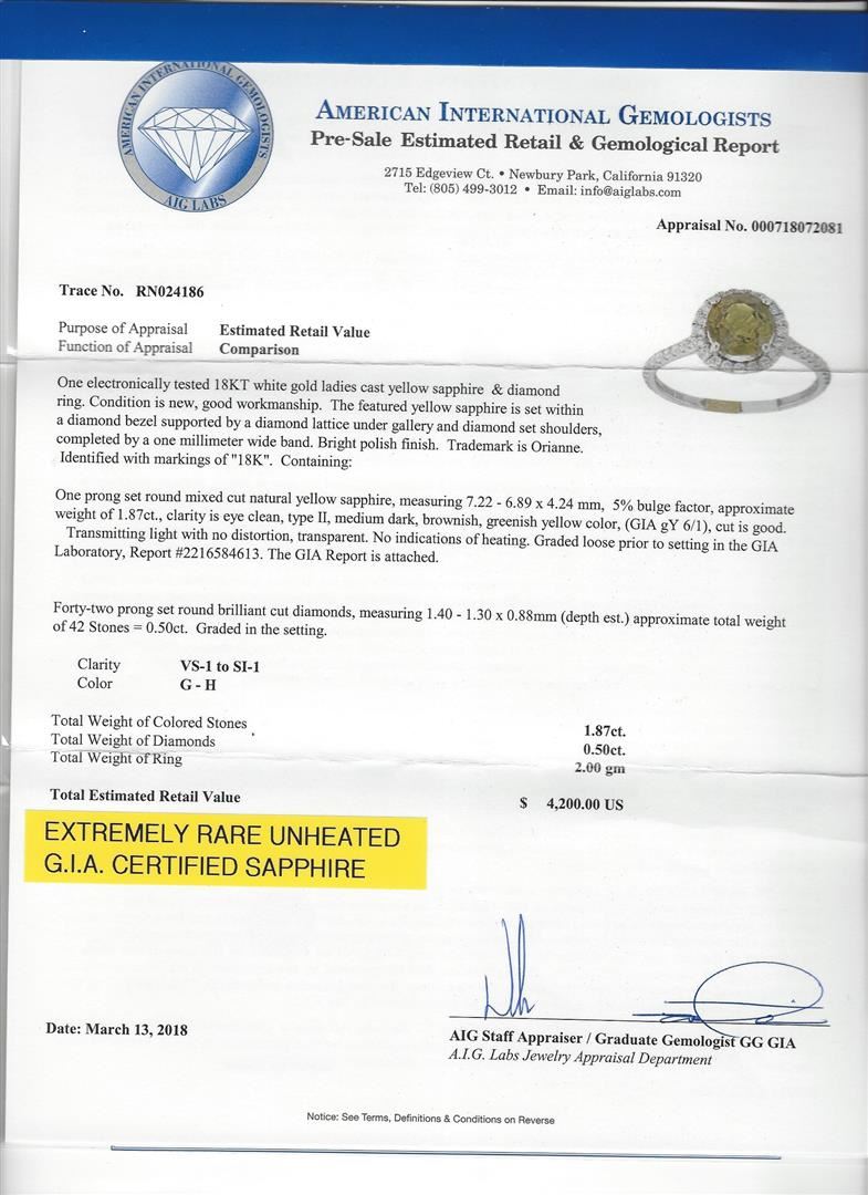 One 1.87ct Sapphire and Diamond Ring - 18KT White Gold. AIG certified. See Appraisal for more details. AIG Appraised.