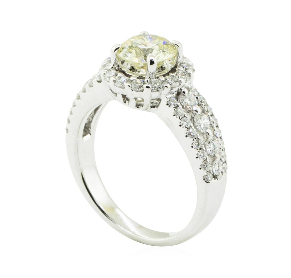 One electronically tested 18KT white gold lady's combination cast & assembled fashion halo engagement ring with a three row cathedral shank with a bright polish finish. The featured lady's ring has a shank measuring 2.40 millimeters in width. Condition is new, good workmanship. Containing: One prong set round brilliant cut diamond, measuring 6.53 - 6.50 x 4.01mm (depth est.) approximate weight of 1.05ct. Graded in the setting. Color S - T Clarity VS-2 Cut Very Good Six prong set round brilliant cut diamonds, measuring 2.35 - 2.20 x 1.41mm (depth est.) approximate total weight of 6 Stones = 0.27ct. Graded in the setting. Color G - H Clarity VS-1 to VS-2 Cut Excellent Sixteen prong set round brilliant cut diamonds, measuring 1.80 - 1.75 x 1.09mm (depth est.) approximate total weight of 16 Stones = 0.34ct. Graded in the setting. Color G - I Clarity VS-1 to VS-2 Cut Excellent Thirty-Two prong set round brilliant cut diamonds, measuring 1.25 - 1.20 x 0.76mm (depth est.) approximate total weight of 32 Stones = 0.22ct. Graded in the setting. Color G - H Clarity VS-1 to SI-1 Cut Excellent. Total Weight of Diamonds 1.88ct.. Total Weight of Engagement Ring 5.50gm GAS Appraised at $11350.00. GAS Appraised.
