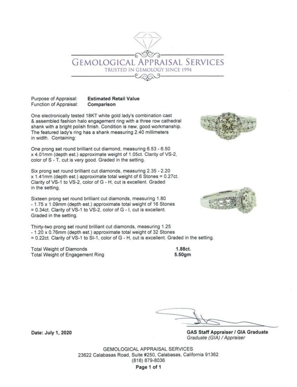 One electronically tested 18KT white gold lady's combination cast & assembled fashion halo engagement ring with a three row cathedral shank with a bright polish finish. The featured lady's ring has a shank measuring 2.40 millimeters in width. Condition is new, good workmanship. Containing: One prong set round brilliant cut diamond, measuring 6.53 - 6.50 x 4.01mm (depth est.) approximate weight of 1.05ct. Graded in the setting. Color S - T Clarity VS-2 Cut Very Good Six prong set round brilliant cut diamonds, measuring 2.35 - 2.20 x 1.41mm (depth est.) approximate total weight of 6 Stones = 0.27ct. Graded in the setting. Color G - H Clarity VS-1 to VS-2 Cut Excellent Sixteen prong set round brilliant cut diamonds, measuring 1.80 - 1.75 x 1.09mm (depth est.) approximate total weight of 16 Stones = 0.34ct. Graded in the setting. Color G - I Clarity VS-1 to VS-2 Cut Excellent Thirty-Two prong set round brilliant cut diamonds, measuring 1.25 - 1.20 x 0.76mm (depth est.) approximate total weight of 32 Stones = 0.22ct. Graded in the setting. Color G - H Clarity VS-1 to SI-1 Cut Excellent. Total Weight of Diamonds 1.88ct.. Total Weight of Engagement Ring 5.50gm GAS Appraised at $11350.00. GAS Appraised.