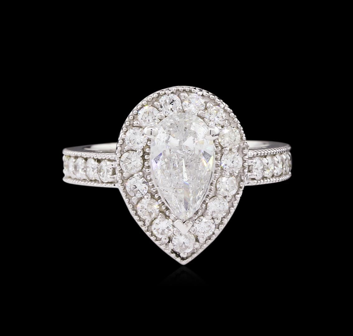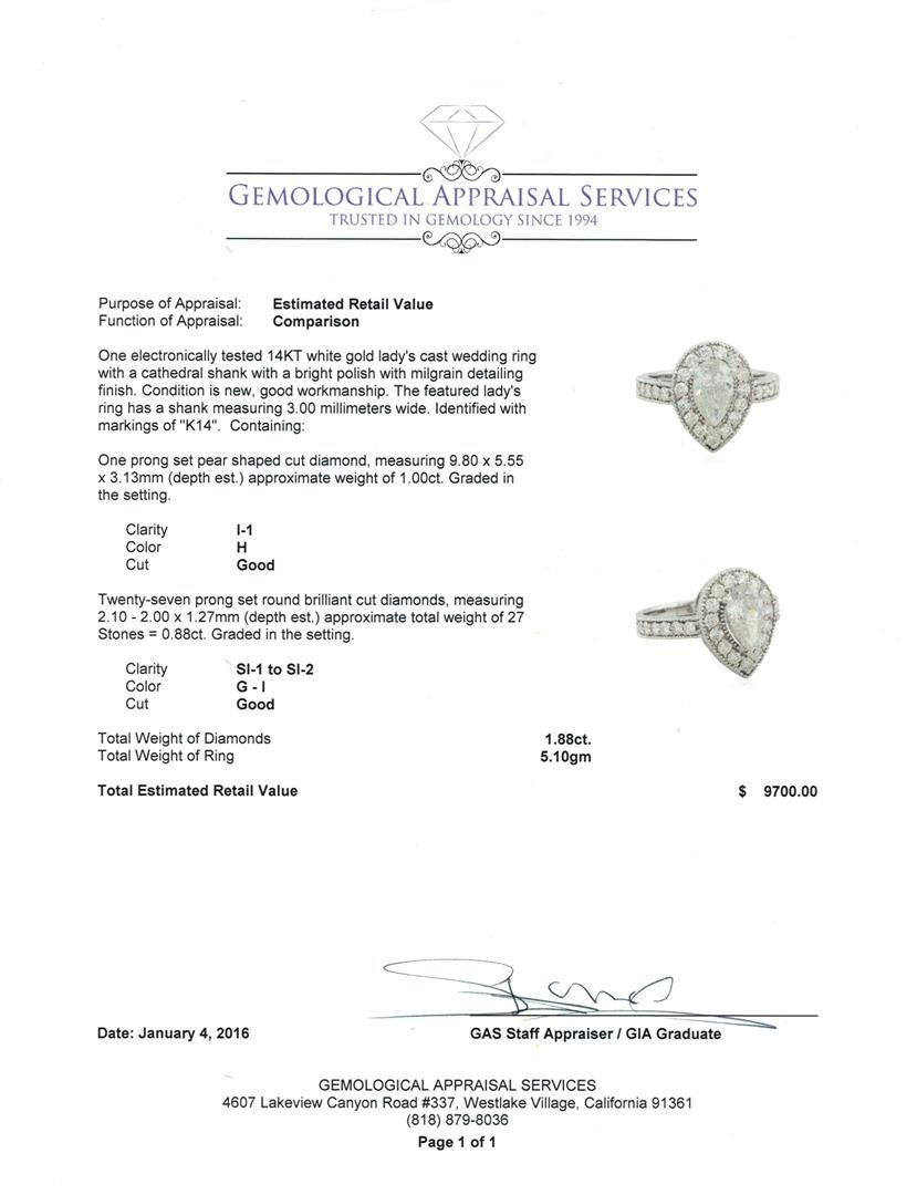 One electronically tested 14KT white gold lady's cast wedding ring with a cathedral shank with a bright polish with milgrain detailing finish. The featured lady's ring has a shank measuring 3.00 millimeters wide. Identified with markings of "K14". Condition is new, good workmanship. Containing: One prong set pear shaped cut diamond, measuring 9.80 x 5.55 x 3.13mm (depth est.) approximate weight of 1.00ct. Graded in the setting. Clarity: I-1. Color: H. Cut Good Twenty-Seven prong set round brilliant cut diamonds, measuring 2.10 - 2.00 x 1.27mm (depth est.) approximate total weight of 27 Stones = 0.88ct. Graded in the setting. Clarity: SI-1 to SI-2. Color: G - I. Cut Good. Total Weight of Diamonds 1.88ct. Total Weight of Ring 5.10gm. GAS Appraised.