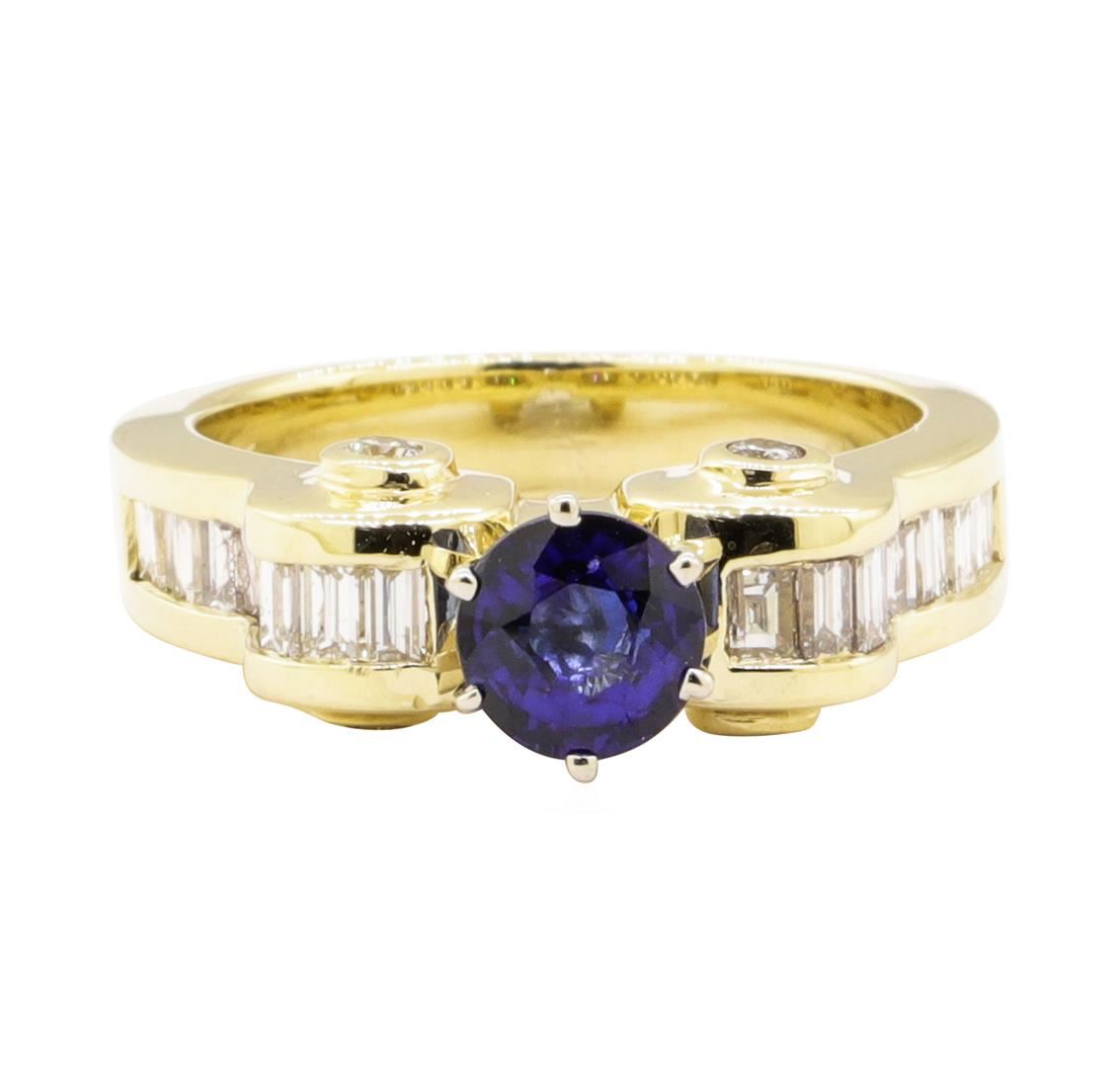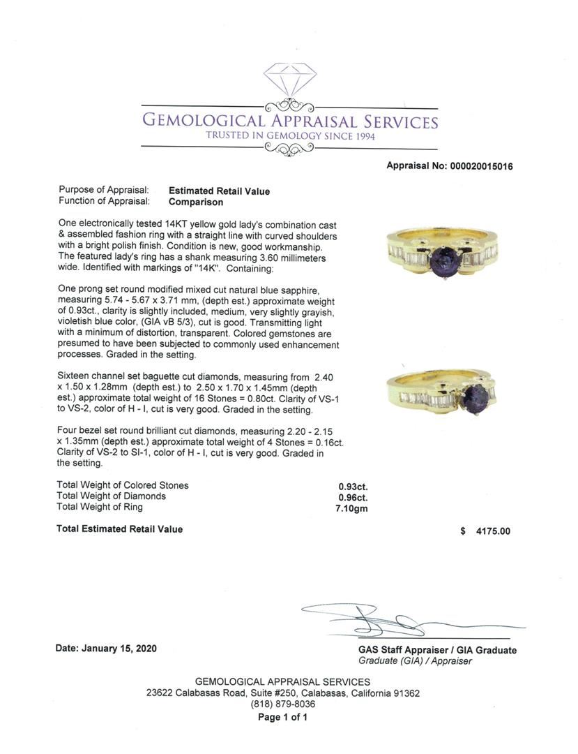 One electronically tested 14KT yellow gold lady's combination cast & assembled fashion ring with a straight line with curved shoulders with a bright polish finish. The featured lady's ring has a shank measuring 3.60 millimeters wide. Identified with markings of '14K'. Condition is new, good workmanship. Containing: One prong set round modified mixed cut natural blue sapphire, measuring 5.74 - 5.67 x 3.71 mm, (depth est.) approximate weight of 0.93ct., clarity is slightly included, medium, very slightly grayish, violetish blue color, (GIA vB 5/3), cut is good. Transmitting light with a minimum of distortion, transparent. Colored gemstones are presumed to have been subjected to commonly used enhancement processes. Graded in the setting. Sixteen channel set baguette cut diamonds, measuring from 2.40 x 1.50 x 1.28mm (depth est.) to 2.50 x 1.70 x 1.45mm (depth est.) approximate total weight of 16 Stones = 0.80ct. Graded in the setting. Color H - I Clarity VS-1 to VS-2 Cut Very Good Four bezel set round brilliant cut diamonds, measuring 2.20 - 2.15 x 1.35mm (depth est.) approximate total weight of 4 Stones = 0.16ct. Graded in the setting. Color H - I Clarity VS-2 to SI-1 Cut Very Good. Total Weight of Colored Stones 0.93ct.. Total Weight of Diamonds 0.96ct.. Total Weight of Ring 7.10gm GAS Appraised at $4175.00. GAS Appraised.