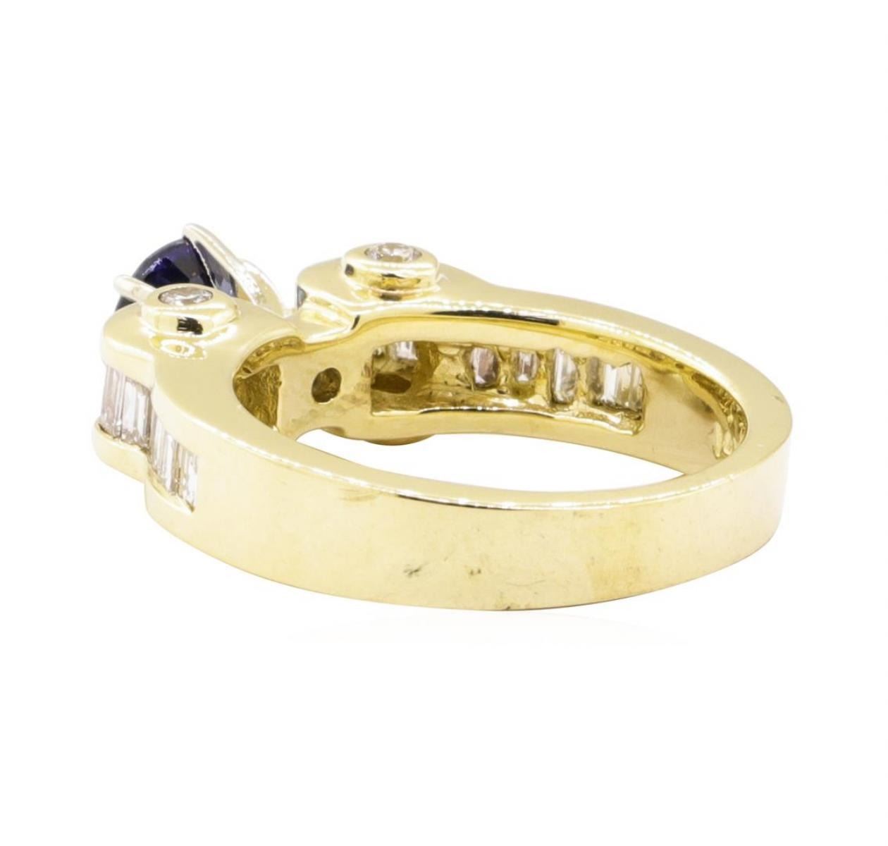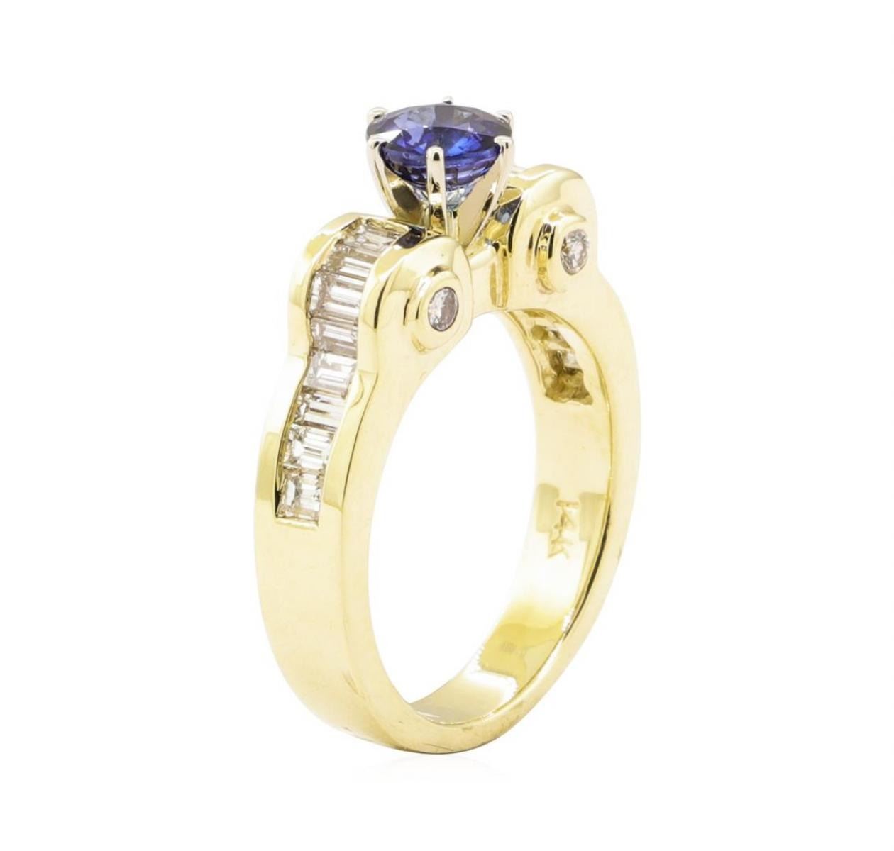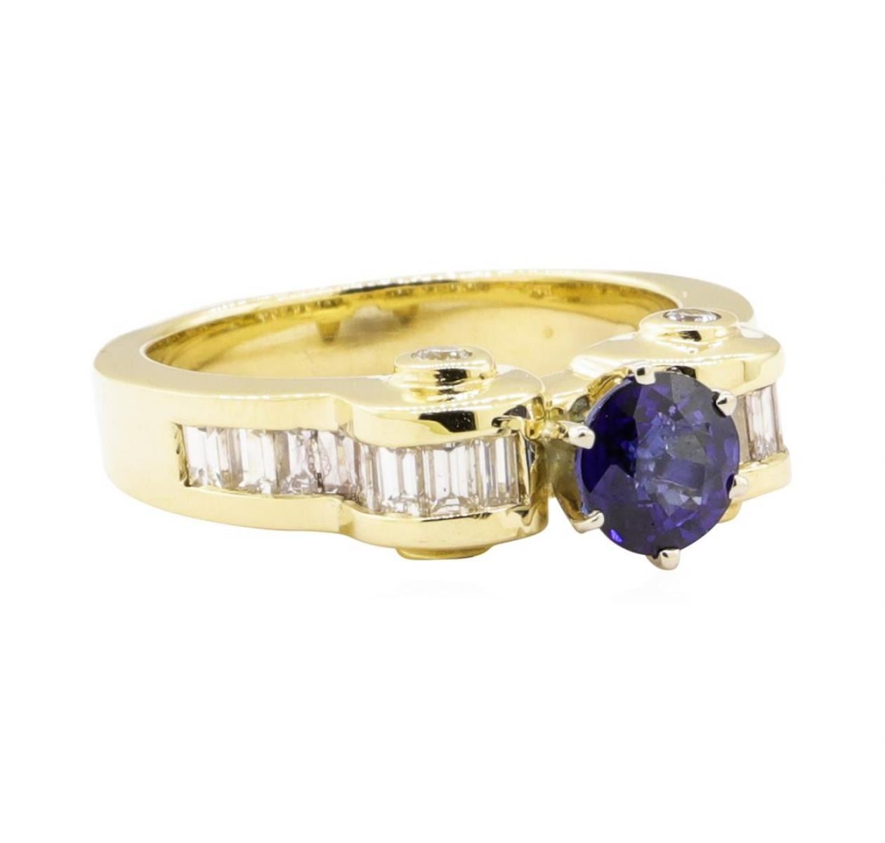 One electronically tested 14KT yellow gold lady's combination cast & assembled fashion ring with a straight line with curved shoulders with a bright polish finish. The featured lady's ring has a shank measuring 3.60 millimeters wide. Identified with markings of '14K'. Condition is new, good workmanship. Containing: One prong set round modified mixed cut natural blue sapphire, measuring 5.74 - 5.67 x 3.71 mm, (depth est.) approximate weight of 0.93ct., clarity is slightly included, medium, very slightly grayish, violetish blue color, (GIA vB 5/3), cut is good. Transmitting light with a minimum of distortion, transparent. Colored gemstones are presumed to have been subjected to commonly used enhancement processes. Graded in the setting. Sixteen channel set baguette cut diamonds, measuring from 2.40 x 1.50 x 1.28mm (depth est.) to 2.50 x 1.70 x 1.45mm (depth est.) approximate total weight of 16 Stones = 0.80 ct. Graded in the setting. Color H - I Clarity VS-1 to VS-2 Cut Very Good Four bezel set round brilliant cut diamonds, measuring 2.20 - 2.15 x 1.35mm (depth est.) approximate total weight of 4 Stones = 0.16ct. Graded in the setting. Color H - I Clarity VS-2 to SI-1 Cut Very Good. Total Weight of Colored Stones 0.93ct.. Total Weight of Diamonds 0.96ct.. Total Weight of Ring 7.10gm GAS Appraised at $4175.00. GAS Appraised.