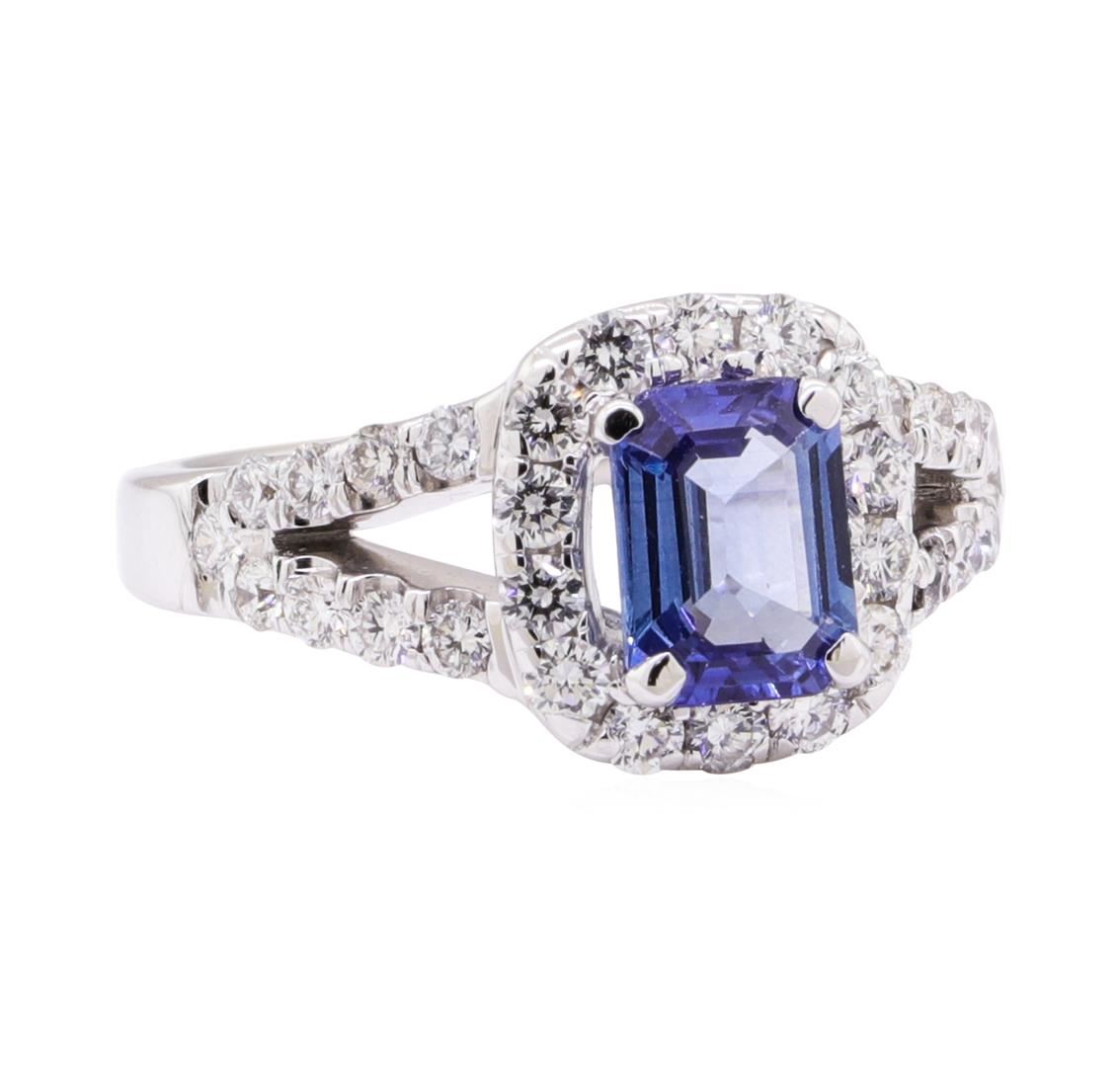 One electronically tested 18KT white gold lady's cast fashion ring with a split shank basket halo with a bright polish finish. The featured lady's ring has a shank measuring 2.15 millimeters wide. Identified with markings of '18K'. Condition is new, good workmanship. Containing: One prong set emerald standard step cut natural blue sapphire, measuring 7.02 x 5.46 x 2.76mm, (depth est.) approximate weight of 1.09ct., clarity is eye clean, medium light, very slightly grayish, very slightly greenish blue color, (GIA vslgB 4/3), cut is very good. Transmitting light with no distortion, transparent. Colored gemstones are presumed to have been subjected to commonly used enhancement processes. Graded in the setting. Thirty-Two prong set round brilliant cut diamonds, measuring 1.90 - 1.80 x 1.15mm (depth est.) approximate total weight of 32 Stones = 0.80ct. Graded in the setting. Color G - H Clarity VS-1 to SI-1 Cut Very Good. Total Weight of Colored Stones 1.09ct.. Total Weight of Diamonds 0.80ct.. Total Weight of Ring 4.70gm GAS Appraised at $4050.00. GAS Appraised.