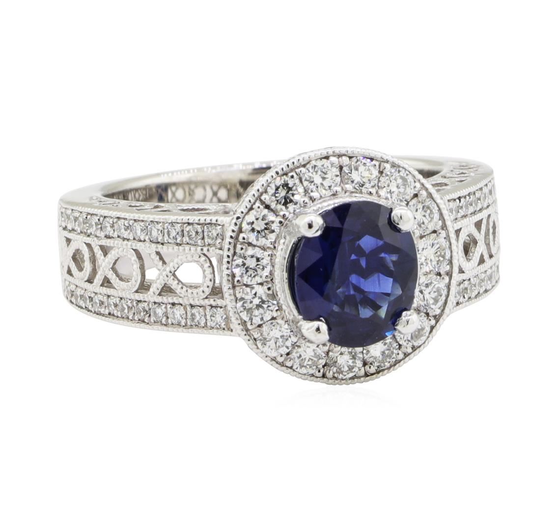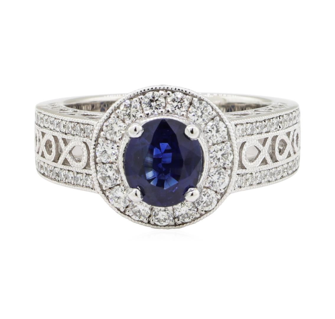 One electronically tested platinum lady's cast fashion ring with a double row wide band halo with a bright polish with milgrain detailing finish. The featured lady's ring has a shank measuring 4.30 millimeters wide. Identified with markings of 'PLAT'. Condition is new, good workmanship. Containing: One prong set oval modified mixed cut natural blue sapphire, measuring 6.73 x 5.73 x 3.30mm, (depth est.) approximate weight of 1.09ct., clarity is eye clean, medium dark, strong, blue color, (GIA B 6/5), cut is very good. Transmitting light with no distortion, transparent. Colored gemstones are presumed to have been subjected to commonly used enhancement processes. Graded in the setting. Sixteen prong set round brilliant cut diamonds, measuring 1.85 - 1.80 x 1.13mm (depth est.) approximate total weight of 16 Stones = 0.38ct. Graded in the setting. Color F - G Clarity VS-1 to VS-2 Cut Very Good Ninety prong set round brilliant cut diamonds, measuring 1.10 - 1.00 x 0.65mm (depth est.) approximate total weight of 90 Stones = 0.42ct. Graded in the setting. Color F - G Clarity VS-1 to SI-1 Cut Very Good. Total Weight of Colored Stones 1.09ct.. Total Weight of Diamonds 0.80ct.. Total Weight of Ring 10.60gm GAS Appraised at $8085.00. GAS Appraised.