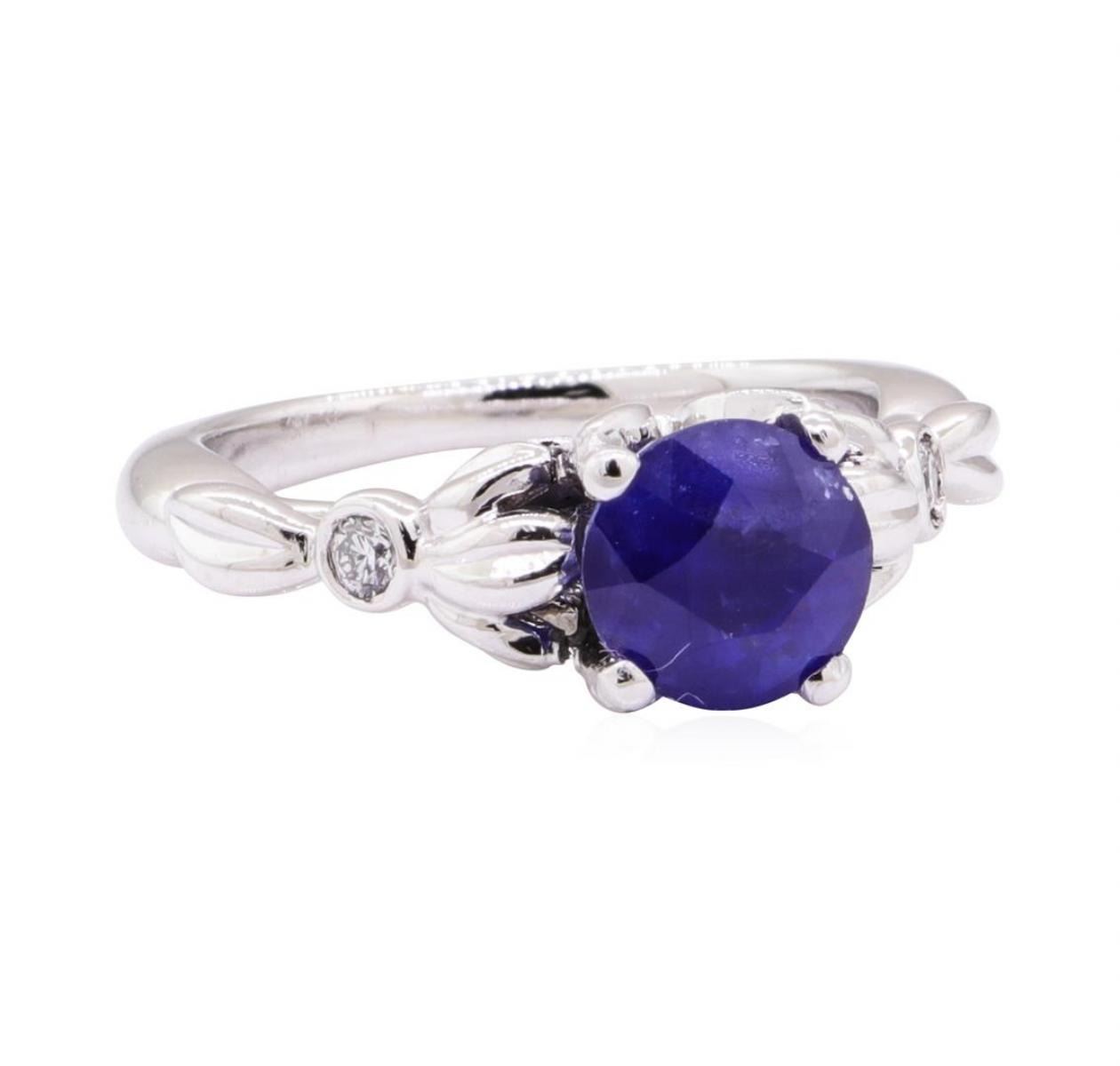 One ring featuring: platinum weighing 7.2 grams containing one round cut blue sapphire weighing 1.76ct and diamonds weighing 0.14ctw. The ring has a floral solitaire motif.