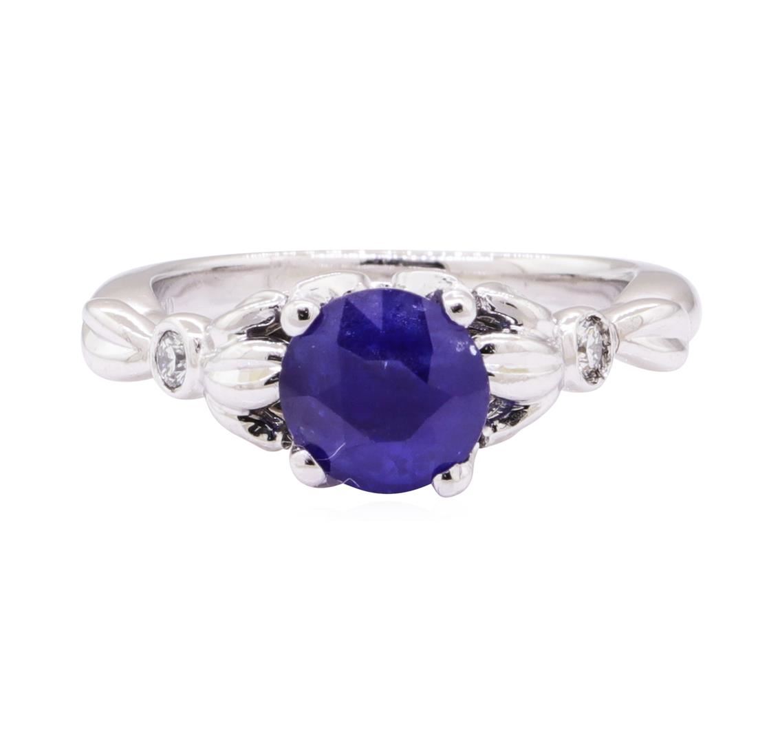One ring featuring: platinum weighing 7.2 grams containing one round cut blue sapphire weighing 1.76ct and diamonds weighing 0.14ctw. The ring has a floral solitaire motif.