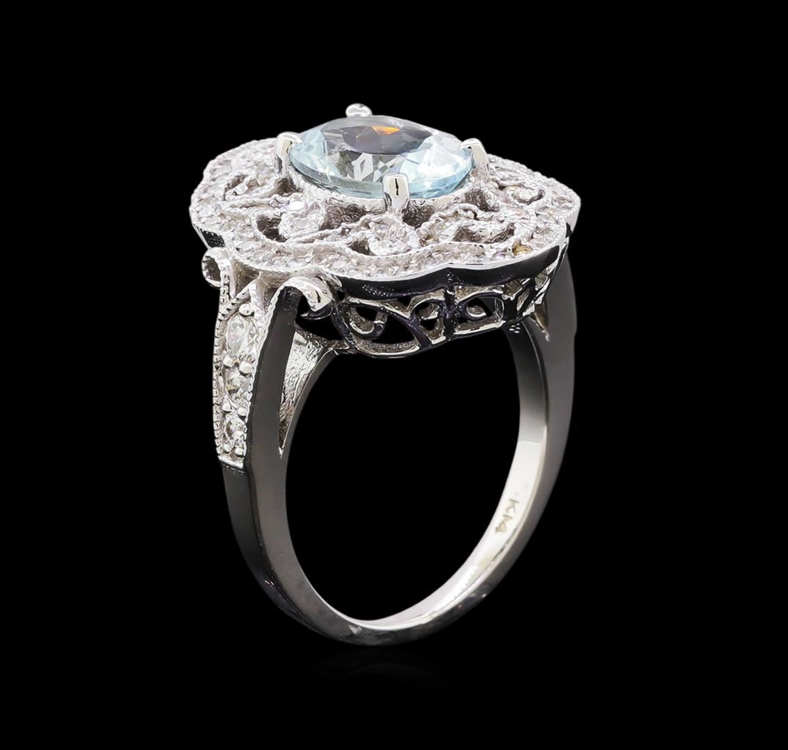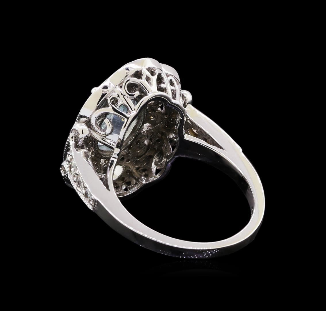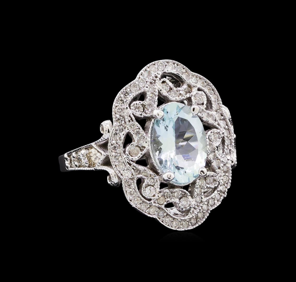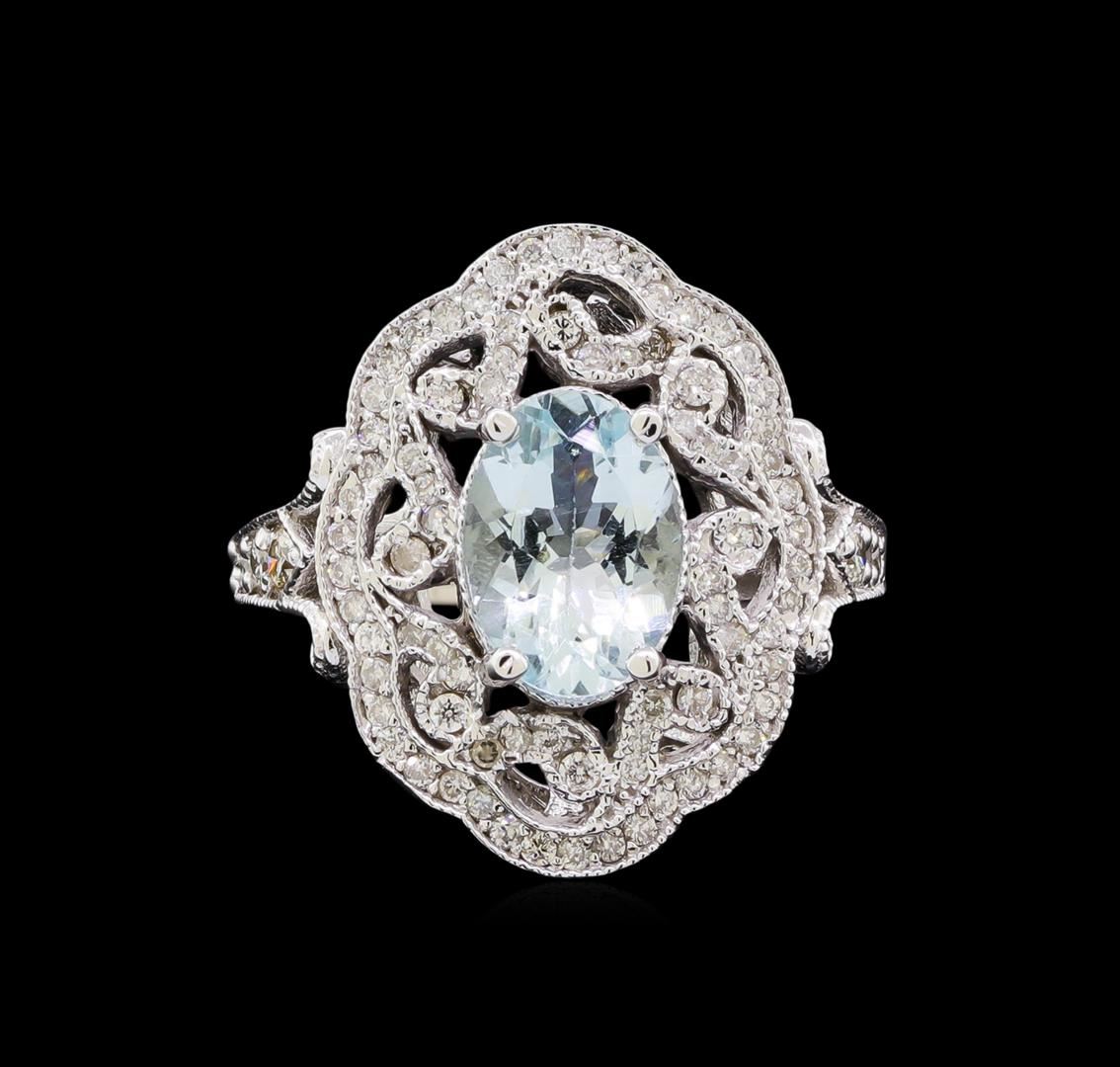 One electronically tested 14KT white gold lady's cast fashion ring with a scalloped halo with a bright polish with milgrain detailing finish. The featured lady's ring has a shank measuring 1.85 millimeters in width. Identified with markings of "K14". Condition is new, good workmanship. Containing: One prong set oval modified brilliant cut natural aquamarine, measuring 10.16 x 7.20 x 4.68mm, (depth est.) approximate weight of 1.92ct., clarity is eye clean, medium light, very slightly grayish, very slightly greenish blue color, (GIA vslgB 4/3), cut is good. Transmitting light with no distortion, transparent. Colored gemstones are presumed to have been subjected to commonly used enhancement processes. Graded in the setting. Six prong set round brilliant cut diamonds, measuring 2.60 - 2.00 x 1.43mm (depth est.) approximate total weight of 6 Stones = 0.26ct. Graded in the setting. Clarity: SI-1 to SI-2. Color: H - I. Cut Good Eight prong set round brilliant cut diamonds, measuring 1.40 - 1.30 x 0.84mm (depth est.) approximate total weight of 8 Stones = 0.08ct. Graded in the setting. Clarity: SI-1 to SI-2. Color: H - I. Cut Very Good Seventy prong set round brilliant cut diamonds, measuring 1.25 - 1.20 x 0.75mm (depth est.) approximate total weight of 70 Stones = 0.45ct. Graded in the setting. Clarity: SI-1 to I-1. Color: H - I. Cut Good. Total Weight of Colored Stones 1.92ct. Total Weight of Diamonds 0.79ct. Total Weight of Ring 7.30gm. GAS Appraised.