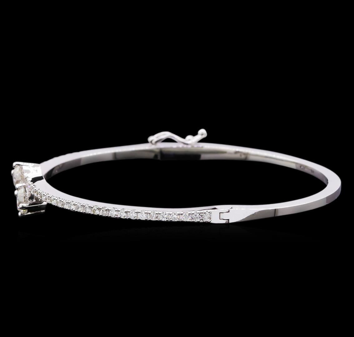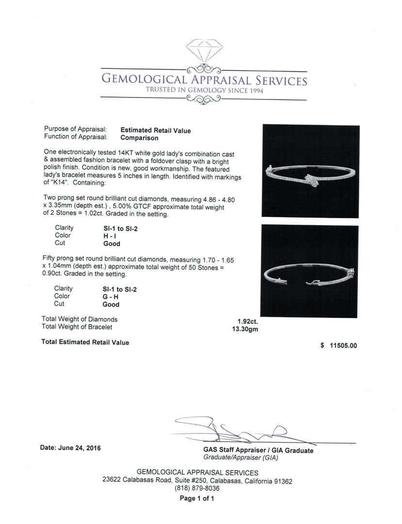 One electronically tested 14KT white gold lady's combination cast & assembled fashion bracelet with a foldover clasp with a bright polish finish. The featured lady's bracelet measures 5 inches in length. Identified with markings of "K14". Condition is new, good workmanship. Containing: Two prong set round brilliant cut diamonds, measuring 4.86 - 4.80 x 3.35mm (depth est.) , 5.00.%. GTCF approximate total weight of 2 Stones = 1.02ct. Graded in the setting. Clarity: SI-1 to SI-2. Color: H - I. Cut Good Fifty prong set round brilliant cut diamonds, measuring 1.70 - 1.65 x 1.04mm (depth est.) approximate total weight of 50 Stones = 0.90ct. Graded in the setting. Clarity: SI-1 to SI-2. Color: G - Good. Total Weight of Diamonds 1.92ct. Total Weight of Bracelet 13.30gm. GAS Appraised.