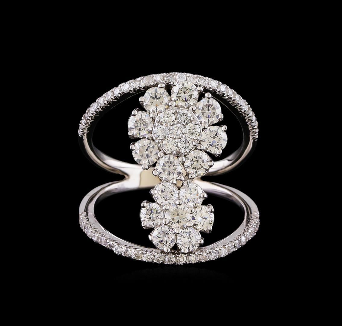 One electronically tested 14KT white gold lady's cast fashion split shank freeform ring with a bright polish finish. The featured lady's has a shank measuring 2.62 millimeters in width. Identified with markings of "K14". Condition is new, good workmanship. Containing: Nine prong set round brilliant cut diamonds, measuring 3.05 - 2.95 x 1.87mm (depth est.) approximate total weight of 9 Stones = 0.96ct. Graded in the setting. Clarity: VS-2 to SI-1. Color: H - I. Cut Very Good Six prong set round brilliant cut diamonds, measuring 2.70 - 2.60 x 1.67mm (depth est.) approximate total weight of 6 Stones = 0.46ct. Graded in the setting. Clarity: SI-1 to SI-2. Color: H - I. Cut Good Seven prong set round brilliant cut diamonds, measuring 1.80 - 1.70 x 1.07mm (depth est.) approximate total weight of 7 Stones = 0.15ct. Graded in the setting. Clarity: SI-1 to SI-2. Color: H - I. Cut Good Fifty-Two prong set round brilliant cut diamonds, measuring 1.25 - 1.20 x 0.75mm (depth est.) approximate total weight of 52 Stones = 0.35ct. Graded in the setting. Clarity: SI-1 to I-1. Color: H - I. Cut Good. Total Weight of Diamonds 1.92ct. Total Weight of Split Shank Freeform Ring 5.80gm. GAS Appraised.