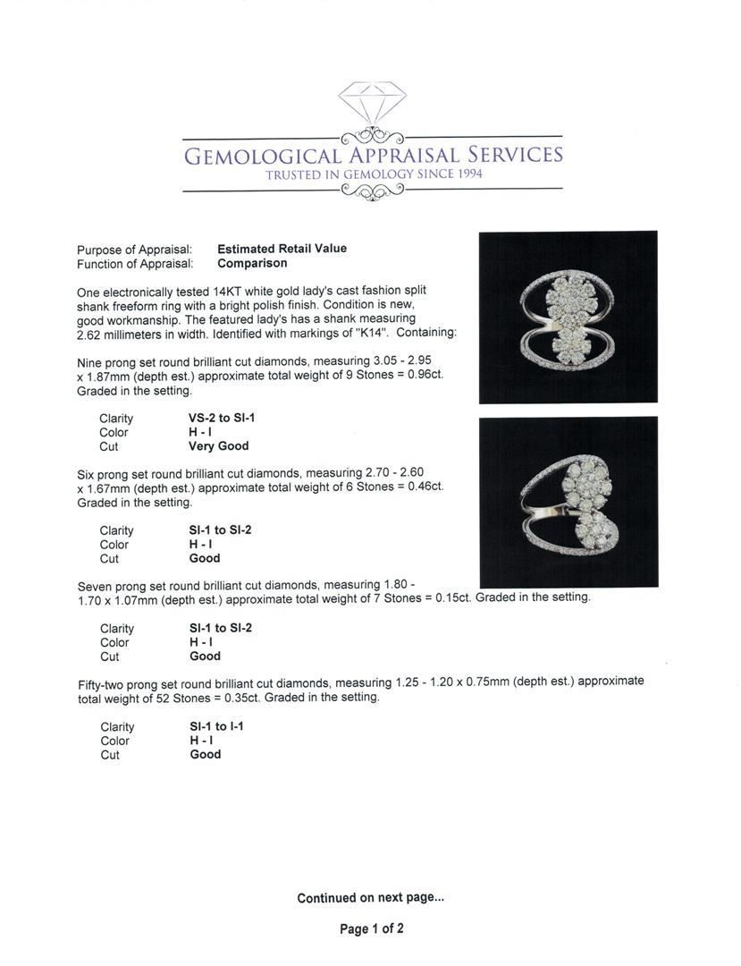 One electronically tested 14KT white gold lady's cast fashion split shank freeform ring with a bright polish finish. The featured lady's has a shank measuring 2.62 millimeters in width. Identified with markings of "K14". Condition is new, good workmanship. Containing: Nine prong set round brilliant cut diamonds, measuring 3.05 - 2.95 x 1.87mm (depth est.) approximate total weight of 9 Stones = 0.96ct. Graded in the setting. Clarity: VS-2 to SI-1. Color: H - I. Cut Very Good Six prong set round brilliant cut diamonds, measuring 2.70 - 2.60 x 1.67mm (depth est.) approximate total weight of 6 Stones = 0.46ct. Graded in the setting. Clarity: SI-1 to SI-2. Color: H - I. Cut Good Seven prong set round brilliant cut diamonds, measuring 1.80 - 1.70 x 1.07mm (depth est.) approximate total weight of 7 Stones = 0.15ct. Graded in the setting. Clarity: SI-1 to SI-2. Color: H - I. Cut Good Fifty-Two prong set round brilliant cut diamonds, measuring 1.25 - 1.20 x 0.75mm (depth est.) approximate total weight of 52 Stones = 0.35ct. Graded in the setting. Clarity: SI-1 to I-1. Color: H - I. Cut Good. Total Weight of Diamonds 1.92ct. Total Weight of Split Shank Freeform Ring 5.80gm. GAS Appraised.