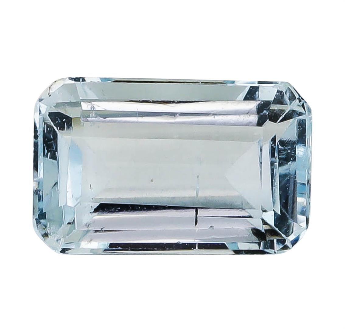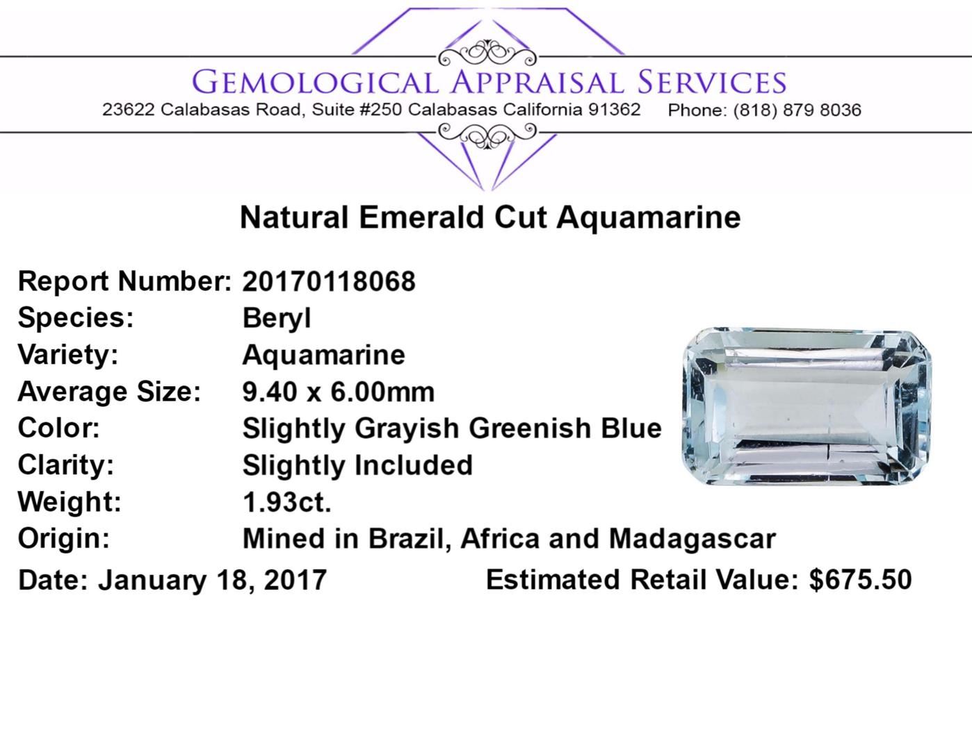 One natural emerald cut aquamarine with an exact weight of 1.93ct., clarity is slightly included, slightly grayish greenish blue. Gemological Appraisals Services estimates the retail value at $675.5 GAS Appraised.