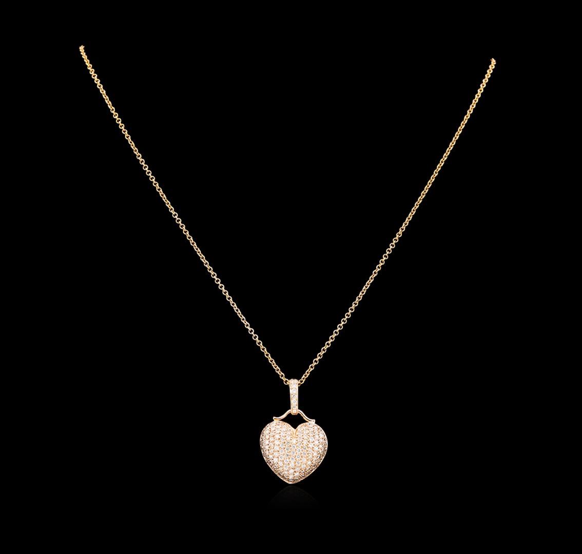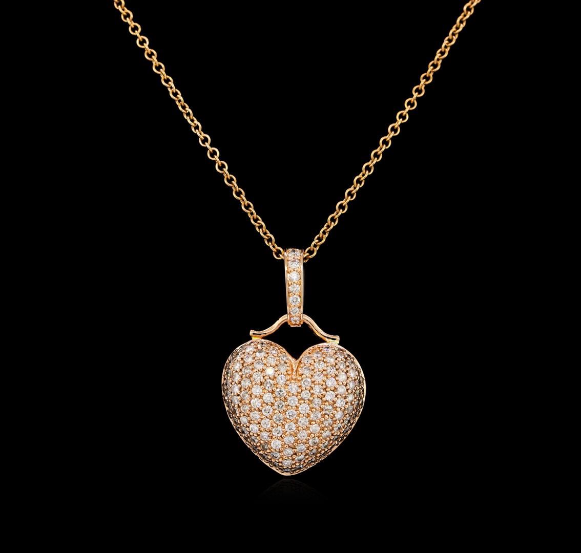 One electronically tested 14KT rose gold lady's combination cast & assembled puffed heart motif pendant & chain 20.0" long, 1.8mm round cable link with a lobster claw clasp with a bright polish finish. Identified with markings of "14K". Condition is new, good workmanship. Containing: One Hundred Thirty-Two prong set round brilliant cut diamonds, measuring 1.60 - 1.50 x 0.95mm (depth est.) approximate total weight of 132 Stones = 1.83ct. Graded in the setting. Clarity: SI-1 to SI-2. Color: G - I. Cut Very Good Four prong set round brilliant cut diamonds, measuring 2.00 - 1.70 x 1.15mm (depth est.) approximate total weight of 4 Stones = 0.10ct. Graded in the setting. Clarity: VS-2 to SI-2. Color: G - Very Good. Total Weight of Diamonds 1.93ct. Total Weight of Pendant & Chain 10.40gm. GAS Appraised at $7,170.00.