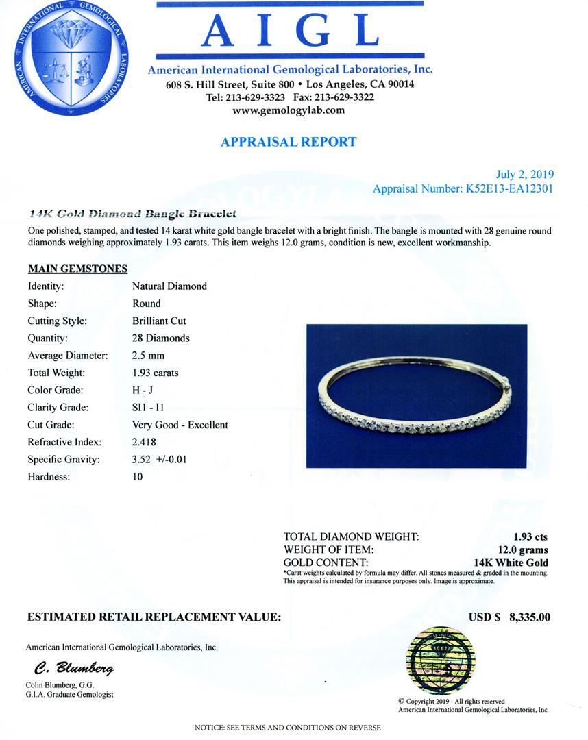 One polished, stamped, and tested 14 karat white gold bangle bracelet with a bright finish. The bangle is mounted with 28 genuine round diamonds weighing approximately 1.93 carats. This item weighs 12.0 grams, condition is new, excellent workmanship. MAIN GEMSTONES Identity: Natural Diamond Shape: Round Cutting Style: Brilliant Cut Quantity: 28 Diamonds Average Diameter: 2.5 mm Total Weight: 1.93 carats Color Grade: H - J Clarity Grade: SI-1 to I-1 Cut Cut Grade: Very Good - Excellent Refractive Index: 2.418 Specific Gravity: 3.52 +/-0.01 Hardness: 10 TOTAL DIAMOND WEIGHT: 1.93 cts WEIGHT OF ITEM: 12.0 grams GOLD CONTENT: 14K White Gold