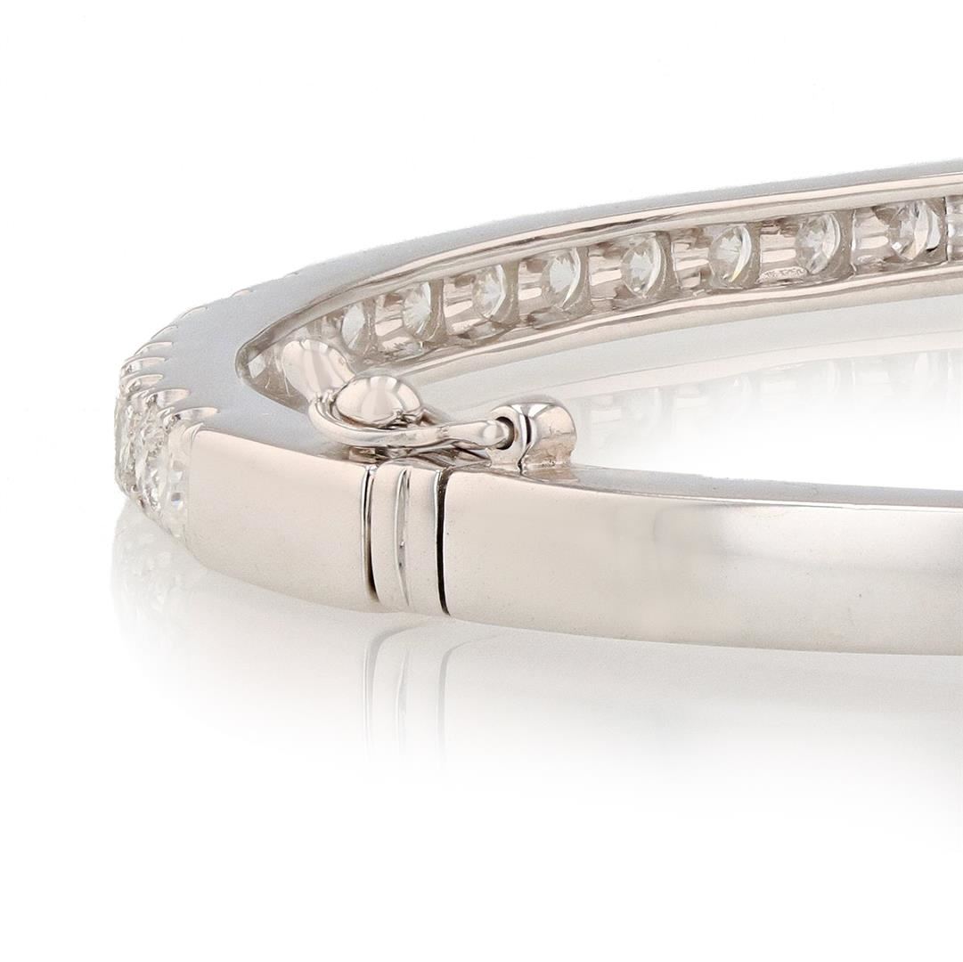 One polished, stamped, and tested 14 karat white gold bangle bracelet with a bright finish. The bangle is mounted with 28 genuine round diamonds weighing approximately 1.93 carats. This item weighs 12.0 grams, condition is new, excellent workmanship. MAIN GEMSTONES Identity: Natural Diamond Shape: Round Cutting Style: Brilliant Cut Quantity: 28 Diamonds Average Diameter: 2.5 mm Total Weight: 1.93 carats Color Grade: H - J Clarity Grade: SI-1 to I-1 Cut Cut Grade: Very Good - Excellent Refractive Index: 2.418 Specific Gravity: 3.52 +/-0.01 Hardness: 10 TOTAL DIAMOND WEIGHT: 1.93 cts WEIGHT OF ITEM: 12.0 grams GOLD CONTENT: 14K White Gold