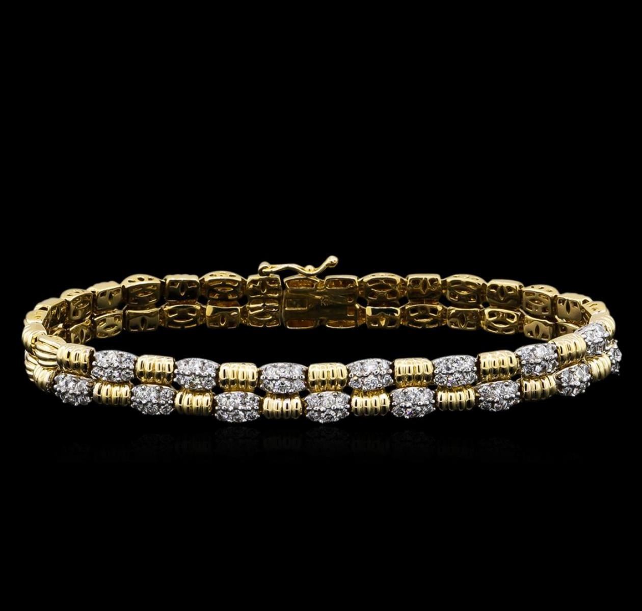 One electronically tested 14KT white and yellow gold lady's combination cast & assembled fashion bracelet with a tongue clasp with foldover safety with a bright polish finish. The featured lady's bracelet has a basket weave motif and measures approximately 7.9 millimeters in width and 7.25 inches in length. Identified with markings of "K14". Condition is new, good workmanship. Containing: Sixty prong set round brilliant cut diamonds, measuring 1.70 - 1.65 x 1.06mm (depth est.) approximate total weight of 60 Stones = 1.10ct. Graded in the setting. Clarity: SI-1 to SI-2. Color: H - I. Cut Good Thirty prong set round brilliant cut diamonds, measuring 2.00 - 1.90 x 1.21mm (depth est.) approximate total weight of 30 Stones = 0.84ct. Graded in the setting. Clarity: SI-1 to SI-2. Color: H - I. Cut Good. Total Weight of Diamonds 1.94ct. Total Weight of Bracelet 23.90gm. GAS Appraised at $8,520.00.