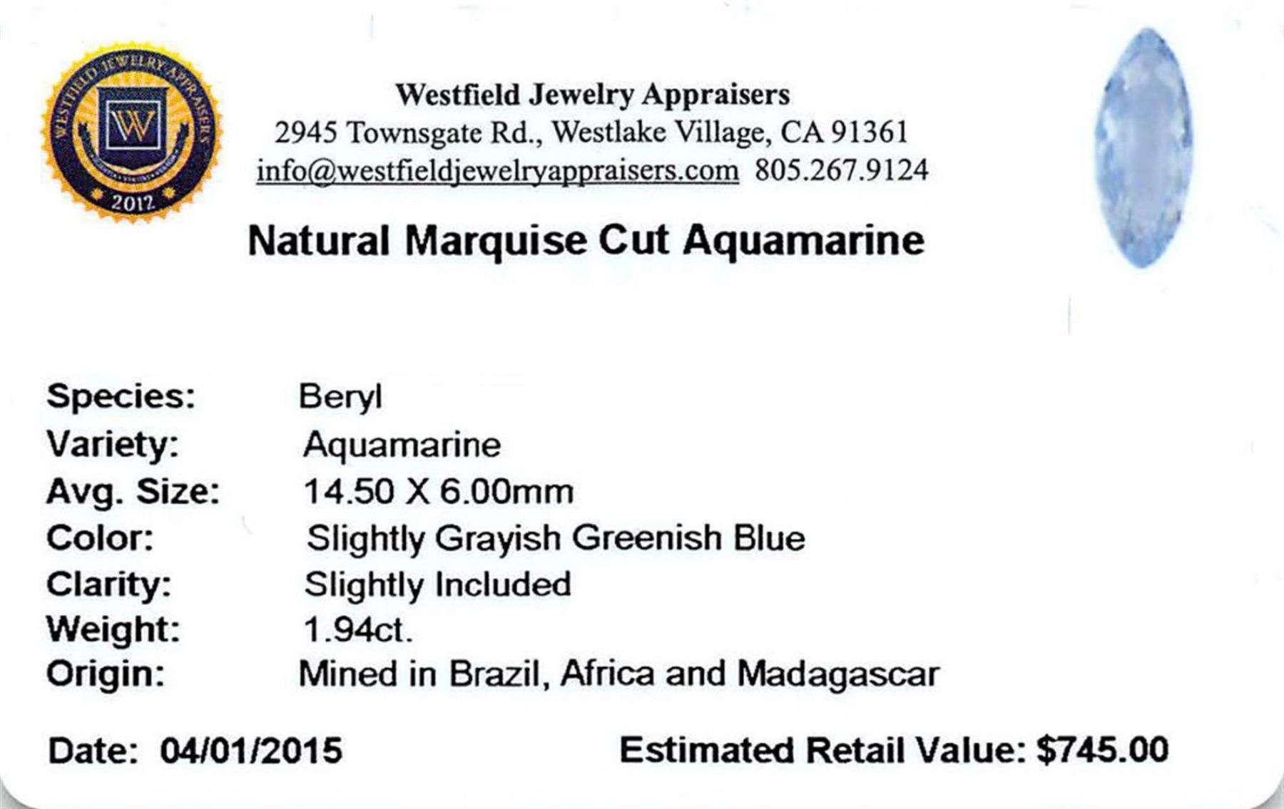 One marquise cut natural aquamarine exact weight 1.94ct., clarity is slightly included, type I, medium, very slightly grayish, very slightly greenish blue color, (GIA vslgB 5/3), cut is good. Westfield Appraised.