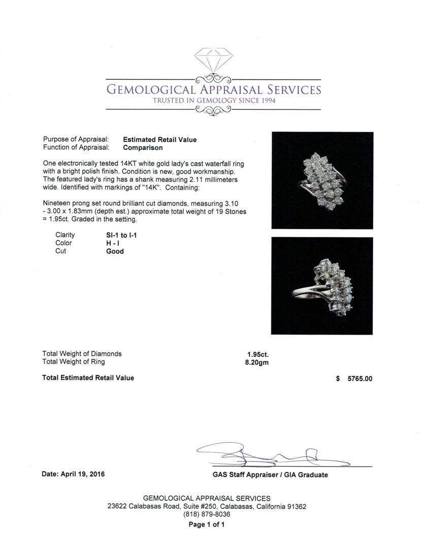 One electronically tested 14KT white gold lady's cast waterfall ring with a bright polish finish. The featured lady's ring has a shank measuring 2.11 millimeters wide. Identified with markings of "14K". Condition is new, good workmanship. Containing: Nineteen prong set round brilliant cut diamonds, measuring 3.10 - 3.00 x 1.83mm (depth est.) approximate total weight of 19 Stones = 1.95ct. Graded in the setting. Clarity: SI-1 to I-1. Color: H - I. Cut Good. Total Weight of Diamonds 1.95ct. Total Weight of Ring 8.20gm. GAS Appraised.