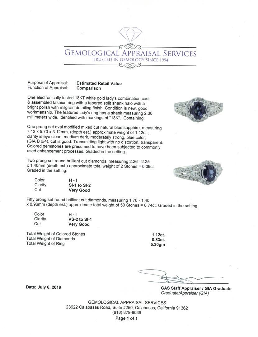 One electronically tested 18KT white gold lady's combination cast & assembled fashion ring with a tapered split shank halo with a bright polish with milgrain detailing finish. The featured lady's ring has a shank measuring 2.30 millimeters wide. Identified with markings of '18K'. Condition is new, good workmanship. Containing: One prong set oval modified mixed cut natural blue sapphire, measuring 7.12 x 5.70 x 3.12mm, (depth est.) approximate weight of 1.12ct., clarity is eye clean, medium dark, moderately strong, blue color, (GIA B 6/4), cut is good. Transmitting light with no distortion, transparent. Colored gemstones are presumed to have been subjected to commonly used enhancement processes. Graded in the setting. Two prong set round brilliant cut diamonds, measuring 2.26 - 2.25 x 1.40mm (depth est.) approximate total weight of 2 Stones = 0.09ct. Graded in the setting. Color H - I Clarity SI-1 to SI-2 Cut Very Good Fifty prong set round brilliant cut diamonds, measuring 1.70 - 1.40 x 0.96mm (depth est.) approximate total weight of 50 Stones = 0.74ct. Graded in the setting. Color H - I Clarity VS-2 to SI-1 Cut Very Good. Total Weight of Colored Stones 1.12ct.. Total Weight of Diamonds 0.83ct.. Total Weight of Ring 5.30gm GAS Appraised at $5205.00. GAS Appraised.