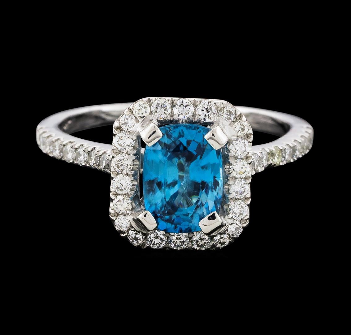 One electronically tested platinum lady's cast fashion ring with a cathedral shank with a basket halo with a bright polish finish. The featured lady's ring has a shank measuring 1.49 millimeters wide. Identified with markings of 'PLAT'. Condition is new, good workmanship. Containing: One prong set rectangular cushion modified mixed cut natural blue zircon, measuring 7.95 x 5.76 x 4.00mm, (depth est.) approximate weight of 1.96ct., clarity is eye clean, medium, moderately strong, green blue color, (GIA GB 5/4), cut is good. Transmitting light with no distortion, transparent. Colored gemstones are presumed to have been subjected to commonly used enhancement processes. Graded in the setting. Forty prong set round brilliant cut diamonds, measuring 1.70 - 1.60 x 0.99mm (depth est.) approximate total weight of 40 Stones = 0.66ct. Graded in the setting. Clarity SI-1 to SI-2. Color: G - H Cut Good. Total Weight of Colored Stones 1.96ct.. Total Weight of Diamonds 0.66ct.. Total Weight of Ring 5.40gm. GAS Appraised.