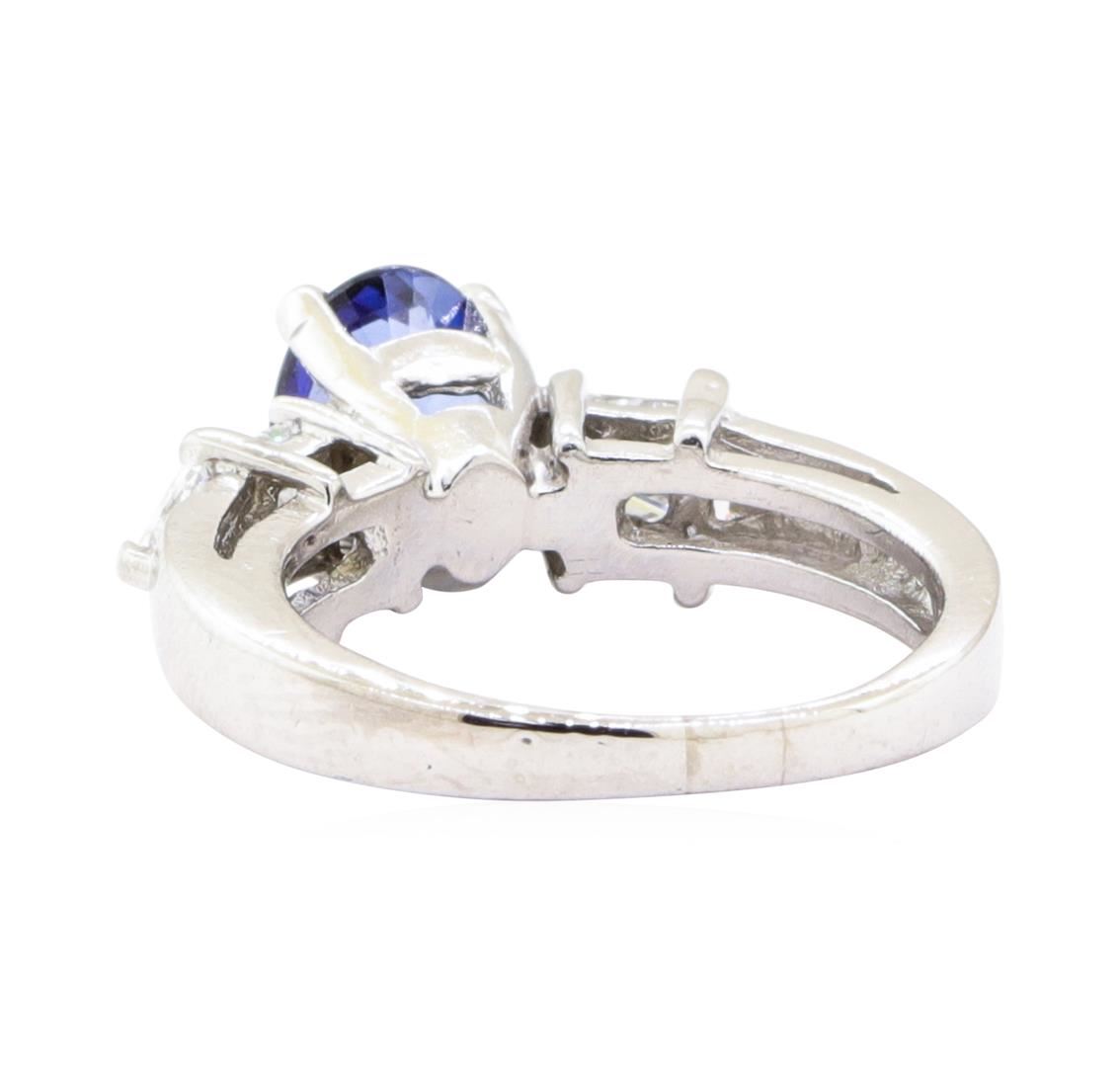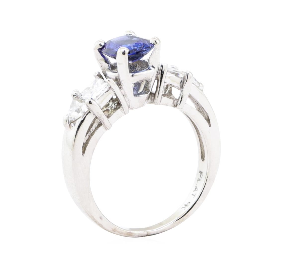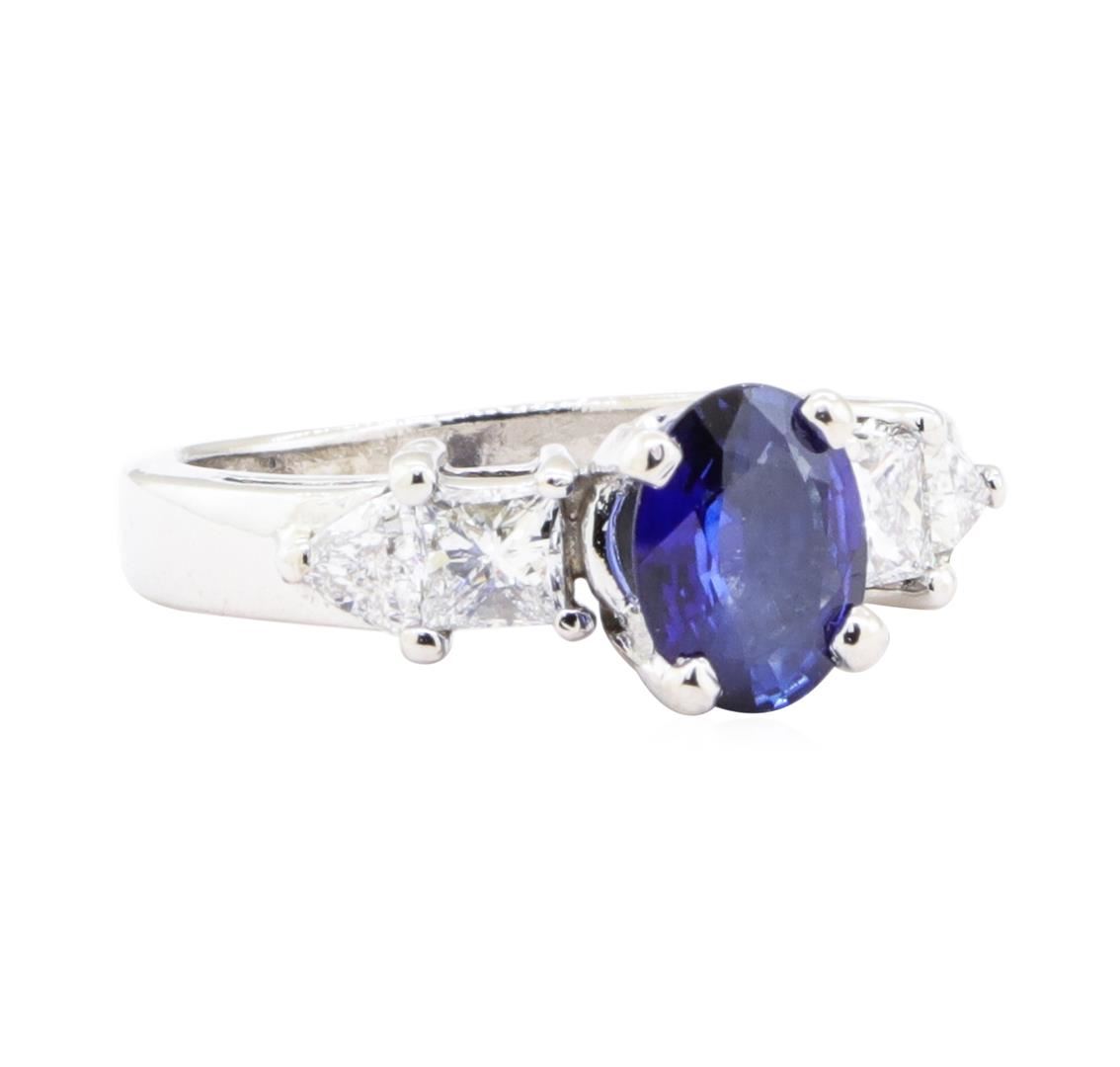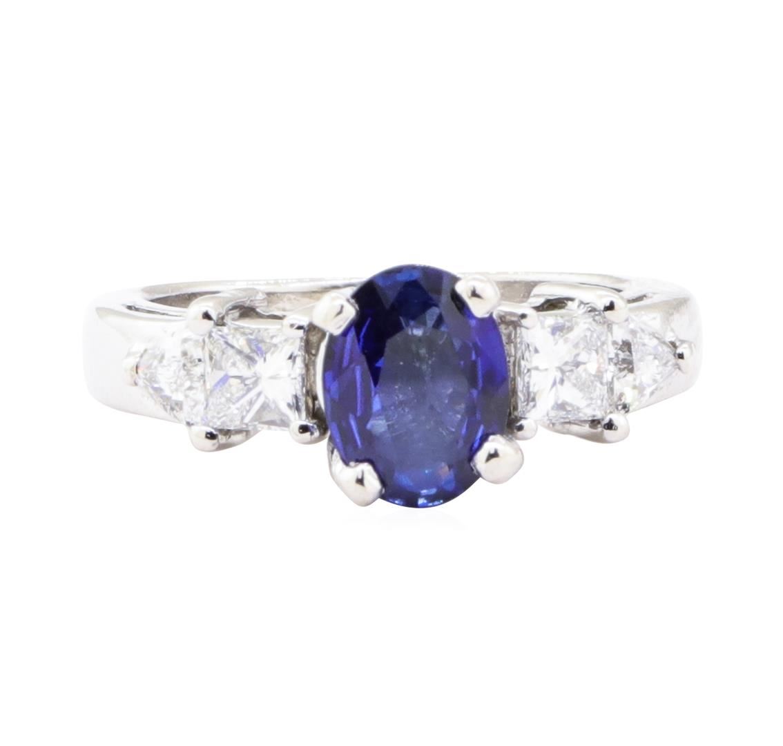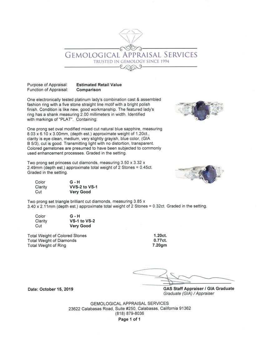 One electronically tested platinum lady's combination cast & assembled fashion ring with a five stone straight line motif with a bright polish finish. The featured lady's ring has a shank measuring 2.00 millimeters in width. Identified with markings of 'PLAT'. Condition is Good. Containing: One prong set oval modified mixed cut natural blue sapphire, measuring 8.03 x 6.10 x 3.00mm, (depth est.) approximate weight of 1.20ct., clarity is eye clean, medium, very slightly grayish, blue color, (GIA B 5/3), cut is good. Transmitting light with no distortion, transparent. Colored gemstones are presumed to have been subjected to commonly used enhancement processes. Graded in the setting. Two prong set princess cut diamonds, measuring 3.50 x 3.32 x 2.49mm (depth est.) approximate total weight of 2 Stones = 0.45ct. Graded in the setting. Color G - H Clarity VVS-2 to VS-1 Cut Very Good Two prong set triangle brilliant cut diamonds, measuring 3.85 x 3.40 x 2.11mm (depth est.) approximate total weight of 2 Stones = 0.32ct. Graded in the setting. Color G - H Clarity VS-1 to VS-2 Cut Very Good. Total Weight of Colored Stones 1.20ct.. Total Weight of Diamonds 0.77ct.. Total Weight of Ring 7.20gm GAS Appraised at $4635.00. GAS Appraised.