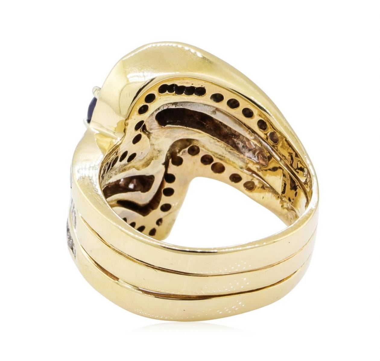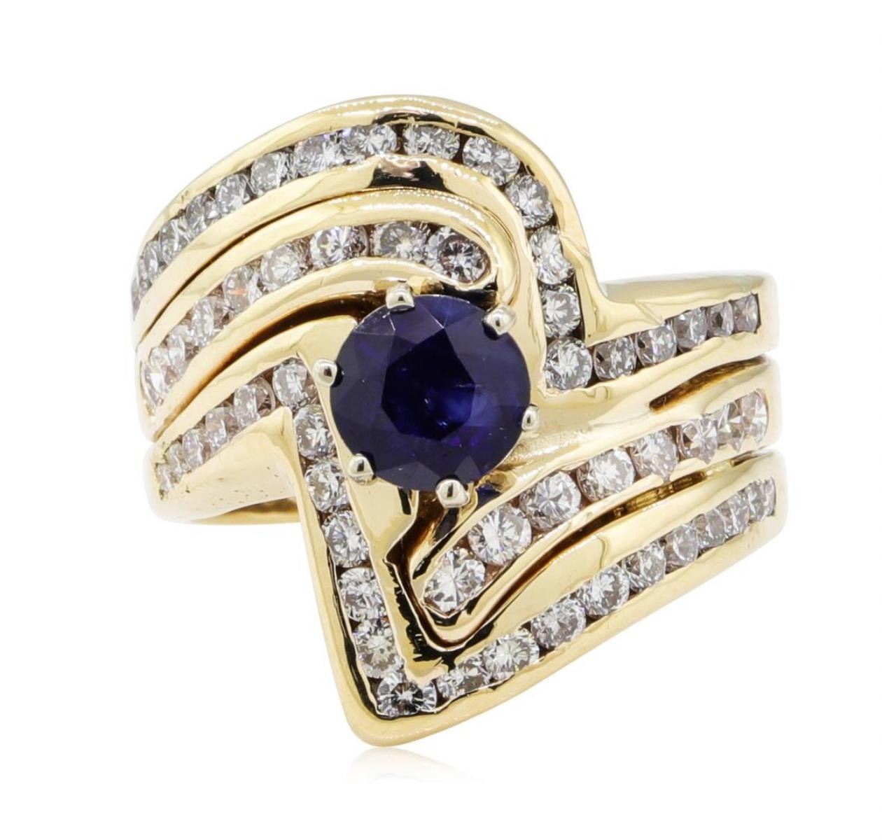 One electronically tested 14KT yellow gold lady's combination cast & assembled fashion ring with a three row bypass motif with a bright polish finish. The featured lady's ring has a triple shank measuring 7.20 millimeters wide. Identified with markings of '14K'. Condition is new, good workmanship. Containing: One prong set round modified mixed cut natural blue sapphire, measuring 5.70 - 5.58 x 3.67 mm, (depth est.) approximate weight of 0.87ct., clarity is heavily included, dark, moderately strong, blue color, (GIA B 7/4), cut is good. Transmitting light somewhat diffusely, semi-transparent to translucent. Naturally occurring internal & external characteristics are present. Colored gemstones are presumed to have been subjected to commonly used enhancement processes. Graded in the setting. Sixty-One channel set round brilliant cut diamonds, measuring 1.80 - 1.55 x 1.04mm (depth est.) approximate total weight of 61 Stones = 1.10 ct. Graded in the setting. Color G - I Clarity VS-2 to SI-1 Cut Very Good. Total Weight of Colored Stones 0.87ct.. Total Weight of Diamonds 1.10 ct.. Total Weight of Ring 11.10gm GAS Appraised at $5020.00. GAS Appraised.