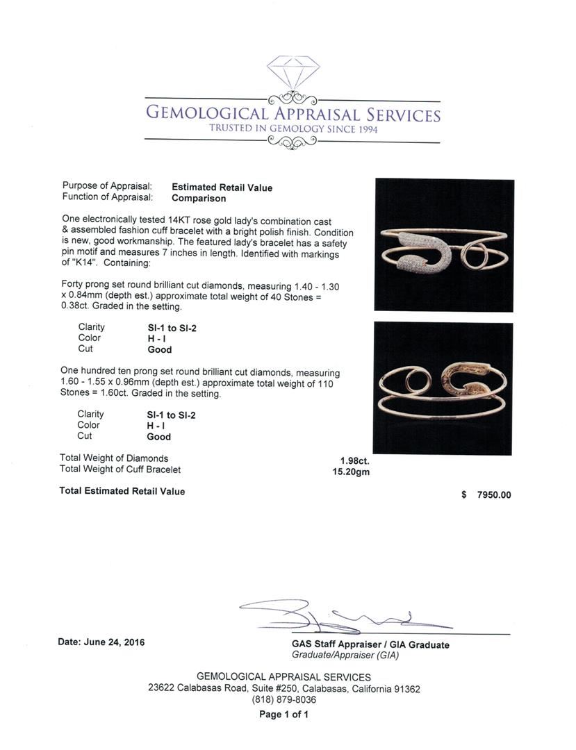 One electronically tested 14KT rose gold lady's combination cast & assembled fashion cuff bracelet with a bright polish finish. The featured lady's bracelet has a safety pin motif and measures 7 inches in length. Identified with markings of "K14". Condition is new, good workmanship. Containing: Forty prong set round brilliant cut diamonds, measuring 1.40 - 1.30 x 0.84mm (depth est.) approximate total weight of 40 Stones = 0.38ct. Graded in the setting. Clarity: SI-1 to SI-2. Color: H - I. Cut Good One Hundred Ten prong set round brilliant cut diamonds, measuring 1.60 - 1.55 x 0.96mm (depth est.) approximate total weight of 110 Stones = 1.60ct. Graded in the setting. Clarity: SI-1 to SI-2. Color: H - I. Cut Good. Total Weight of Diamonds 1.98ct. Total Weight of Cuff Bracelet 15.20gm. GAS Appraised.