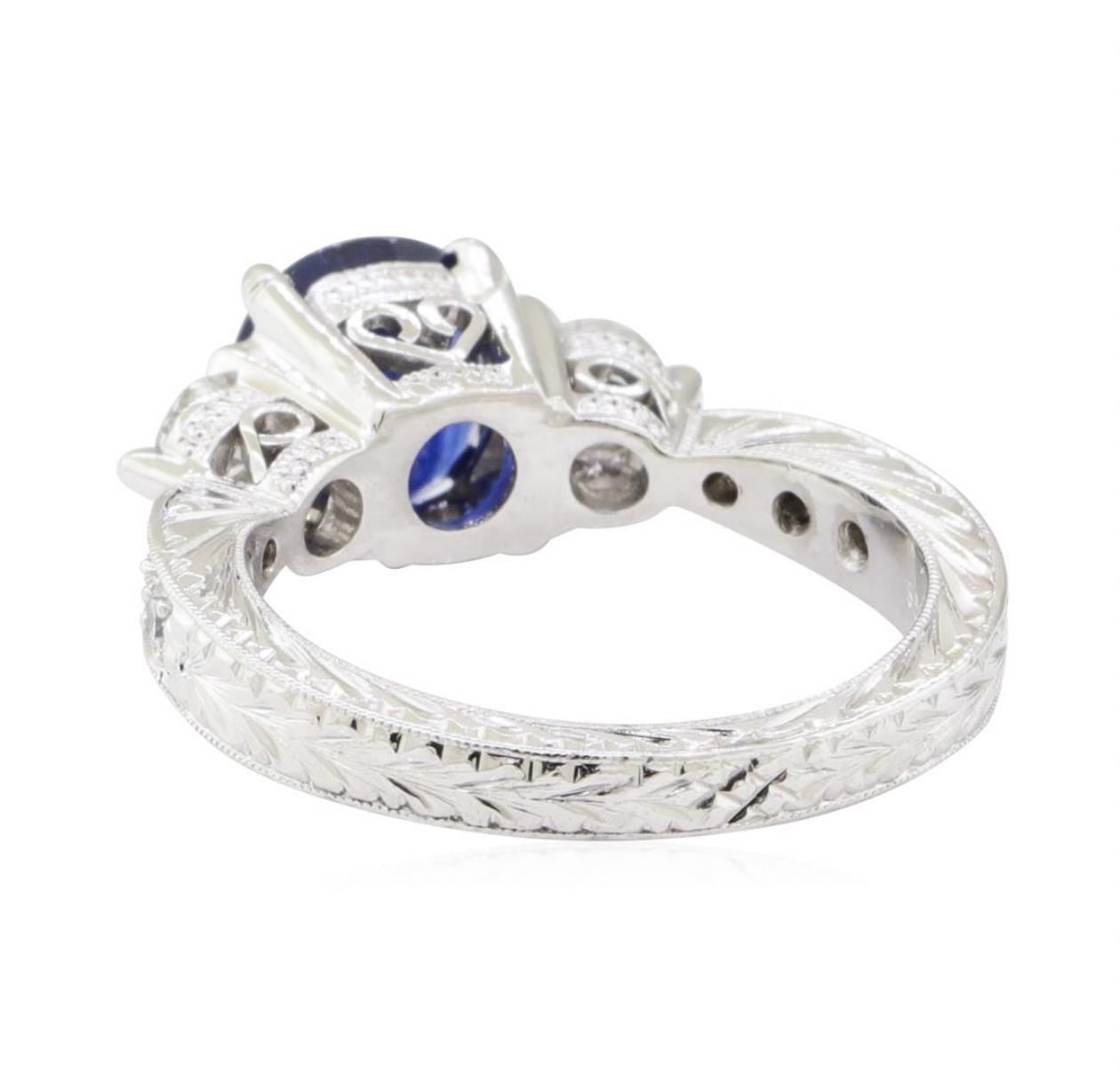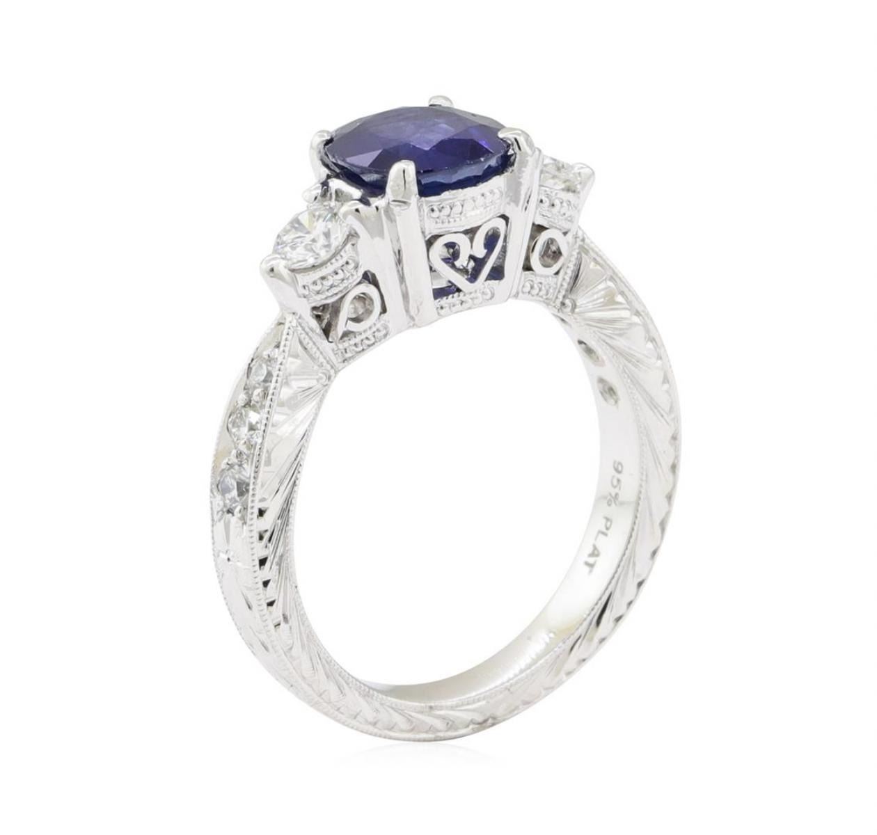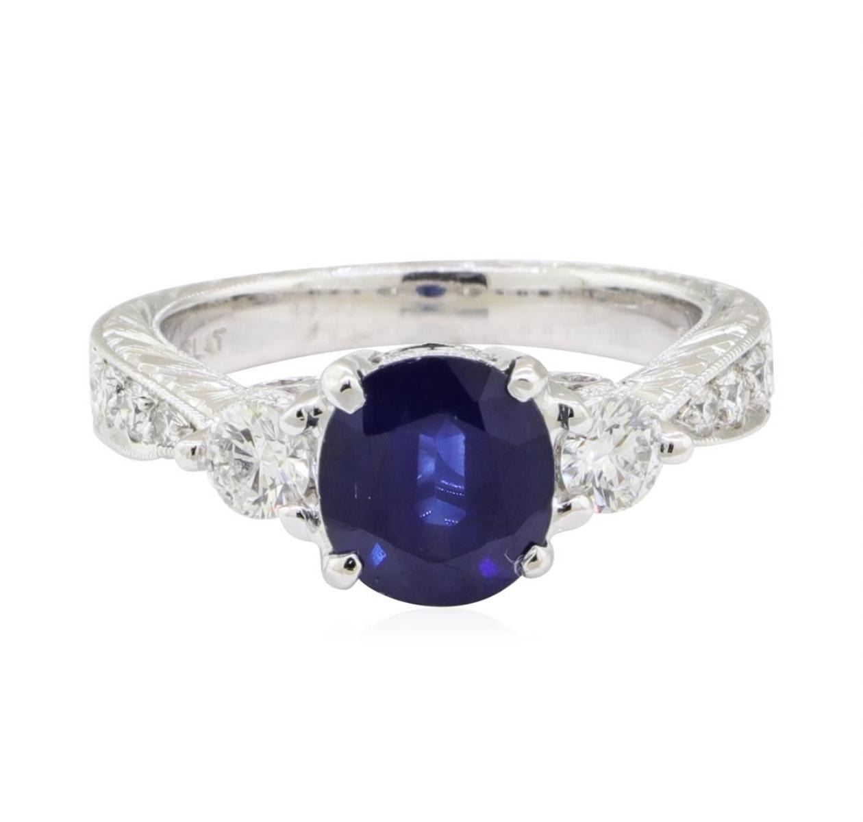 One electronically tested platinum lady's cast fashion ring with a three stone motif with a bright polish with milgrain detailing finish. The featured lady's ring has hand engraved detailing and a shank measuring 2.40 millimeters wide. Trademark is Coast. Identified with markings of 'PT 950'. Condition is new, good workmanship. Containing: One prong set oval modified mixed cut natural blue sapphire, measuring 7.34 x 6.69 x 3.66mm, (depth est.) approximate weight of 1.54ct., clarity is heavily included, medium dark, moderately strong, blue color, (GIA B 6/4), cut is good. Transmitting light somewhat diffusely, semi-transparent to translucent. Colored gemstones are presumed to have been subjected to commonly used enhancement processes. Graded in the setting. Two prong set round brilliant cut diamonds, measuring 3.40 - 3.38 x 2.03mm (depth est.) approximate total weight of 2 Stones = 0.30ct. Graded in the setting. Color F - G Clarity VS-1 to VS-2 Cut Very Good Six bead set round brilliant cut diamonds, measuring 2.00 - 1.75 x 1.17mm (depth est.) approximate total weight of 6 Stones = 0.15ct. Graded in the setting. Color F - G Clarity VS-1 to VS-2 Cut Very Good. Total Weight of Colored Stones 1.54ct.. Total Weight of Diamonds 0.45ct.. Total Weight of Ring 7.70gm GAS Appraised at $4340.00. GAS Appraised at $4,340.00.