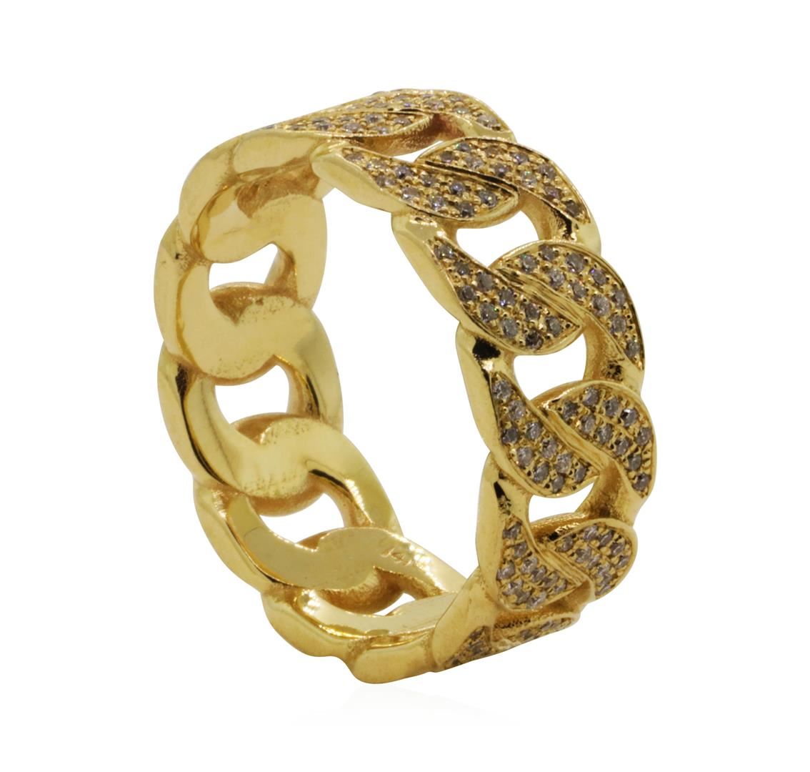 One electronically tested 14KT yellow gold lady's cast fashion curb link eternity band with a bright polish finish. This featured lady's ring has a shank measuring 7.86 millimeters in width. Identified with markings of '14K'. Condition is new, good workmanship. Containing: Two Hundred Forty prong set round brilliant cut diamonds, measuring 1.10 - 0.90 x 0.62mm (depth est.) approximate total weight of 240 Stones = 1.00ct. Graded in the setting. Color G - H Clarity VS-2 to SI-1 Cut Very Good. Total Weight of Diamonds 1.00ct.. Total Weight of Band 7.00gm GAS Appraised at $5260.00. GAS Appraised.