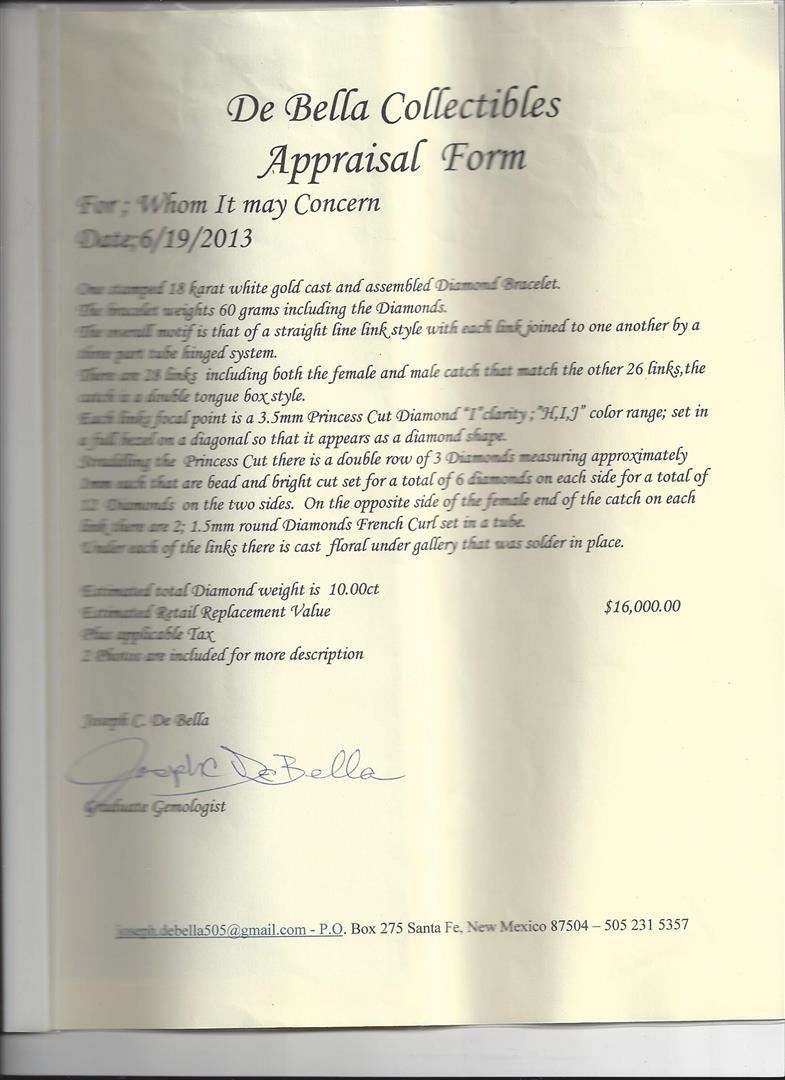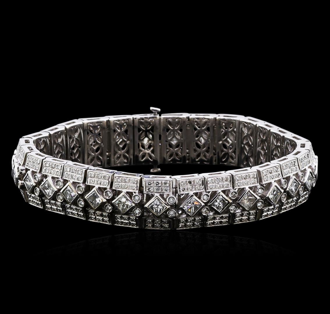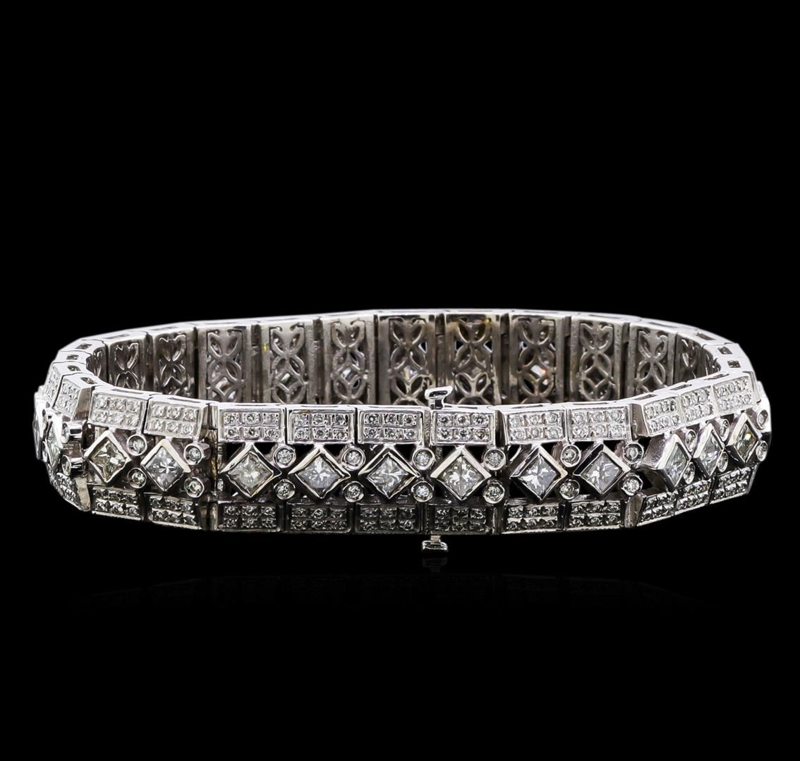One stamped 18 karat white gold cast and assembled diamond bracelet. The bracelet weights 60 grams including the diamonds. The overall motif is that of a straight link style with each link joined to one another by a three part tub hinged system. There are 28 links including both the female and male catch that match the other 26 links, the catch is a double tongue box style. Each links focal point is a 3.5mm princess cut diamond "I" clarity; "H,I,J" color range; set in a full bezel on a diagonal so that it appears as a diamond shape. Straddling the princess cut there is a double row of 3 diamonds measuring approximately 1mm each that are bead and bright cut set for a total of 6 diamonds on each side for a total of 12 diamond on the two sides. On the opposite side of the female end of the catch on each link there are 2; 1.5mm round diamonds French curl set in a tube. Under each of the links there is cast floral under gallery that was solder in place. Estimated total diamond weight is 10.00ct.