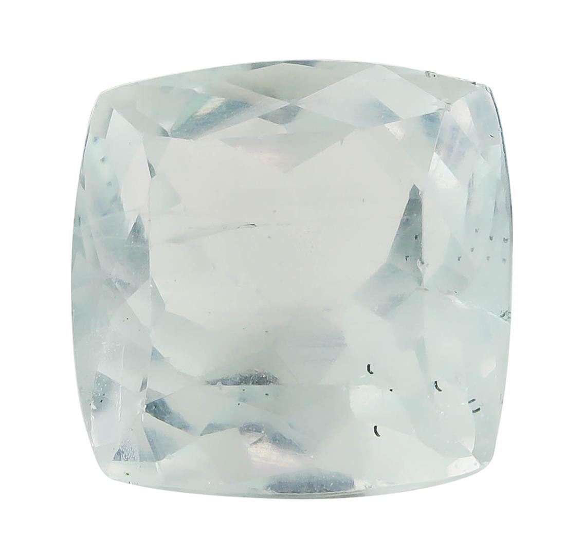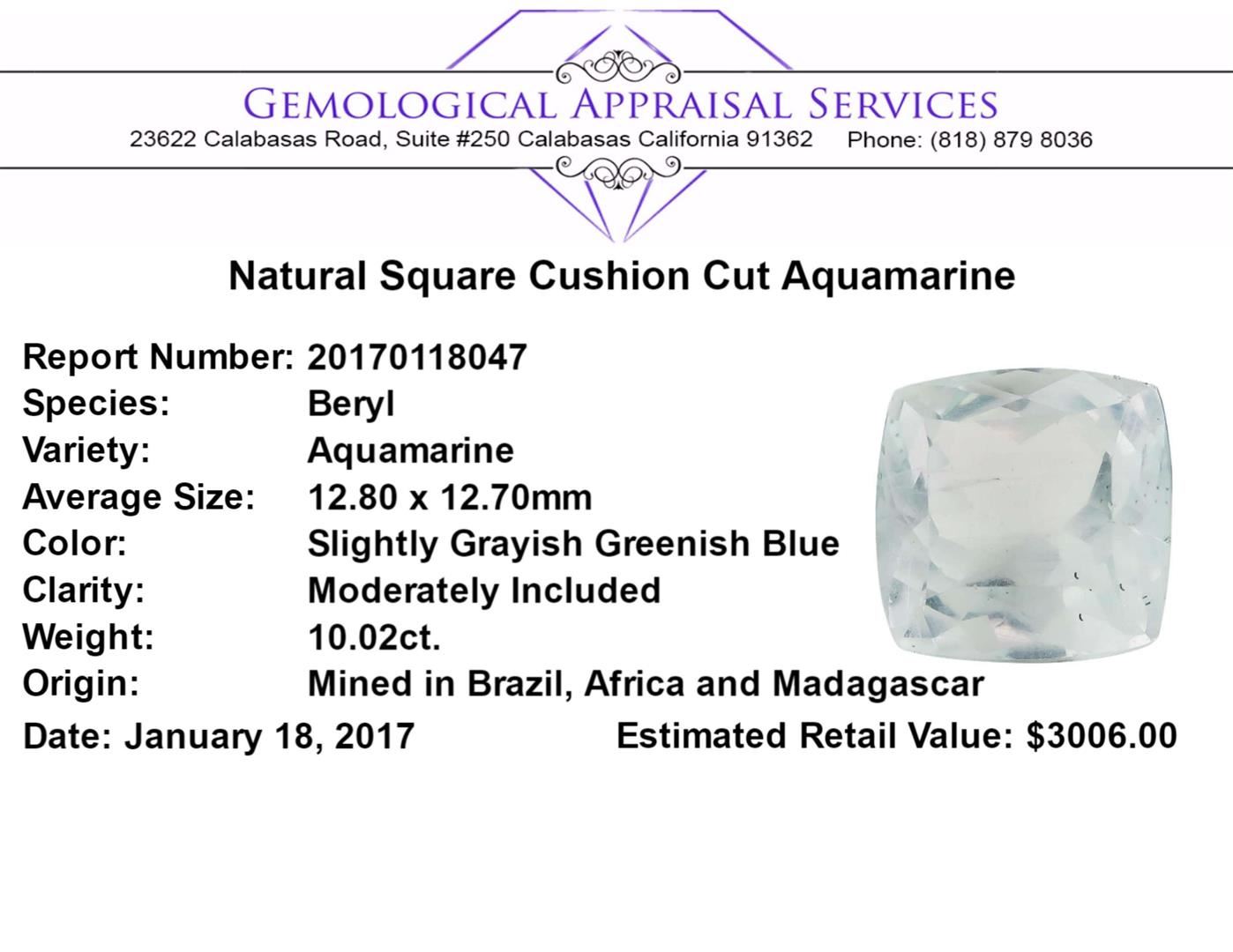 One natural square cushion cut aquamarine with an exact weight of 10.02ct., clarity is moderately included, slightly grayish greenish blue. Gemological Appraisals Services estimates the retail value at $3006 GAS Appraised.