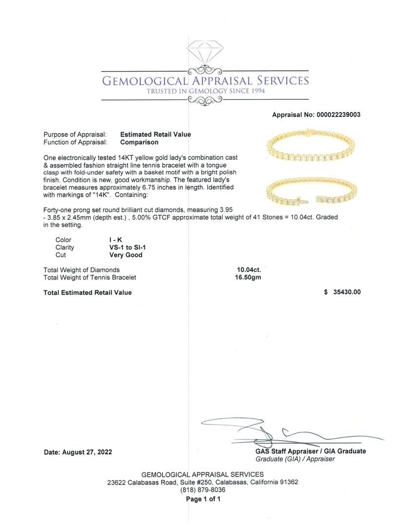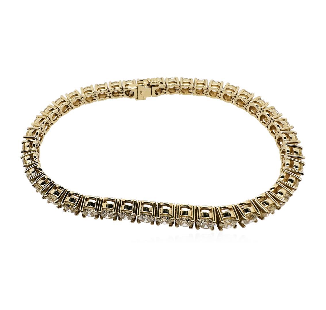 One electronically tested 14KT yellow gold lady's combination cast & assembled fashion straight line tennis bracelet with a tongue clasp with fold-under safety with a basket motif with a bright polish finish. Condition is new, good workmanship. The featured lady's bracelet measures approximately 6.75 inches in length. Identified with markings of "14K". Containing Forty-one prong set round brillant cut diamonds, measuring 3.95-3.85 x 2.45mm (depth est.), 5.00% GTCF approximate total weight of 41 Stones = 10.04ct. Graded the setting. Total Weight of Diamonds: 10.04ct. Total Weight: 16.50gm. Total Estimated Retail Value: $ 35430.00