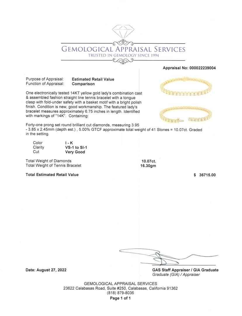 One electronically tested 14KT yellow gold lady's combination cast assembled fashion straight line tennis bracelet with tongue clasp fold-under safety with basket motif with bright finish. Condition new, good workmanship. The featured lady's bracelet measures approximately 6.75 inches length. Identified with markings of "14K" Containing: Forty-one prong set round briliant cut diamonds. 3.85 x 2.45mm (depth est.) 5.00% GTCF I-K VS-1 to SI-1. Very Good Total of Weight Diamonds 10.07ct. Total Weight of Tennis Bracelet 16.30gm. Total Estimated Retail Value 36715.00