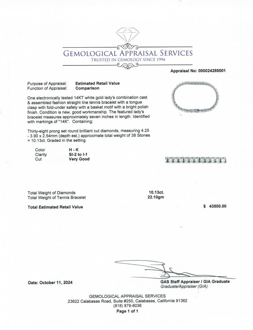 Perfect for adding a touch of everyday elegance, this 14KT white gold tennis bracelet is an exquisite choice. Designed with a basket motif, tongue clasp, and safety fold, the 7-inch bracelet features 38 prong-set round brilliant diamonds totaling 10.13 carats, graded VS-1 to SI-1 in clarity and H to K in color. It's a refined piece that brings subtle sophistication to any outfit.