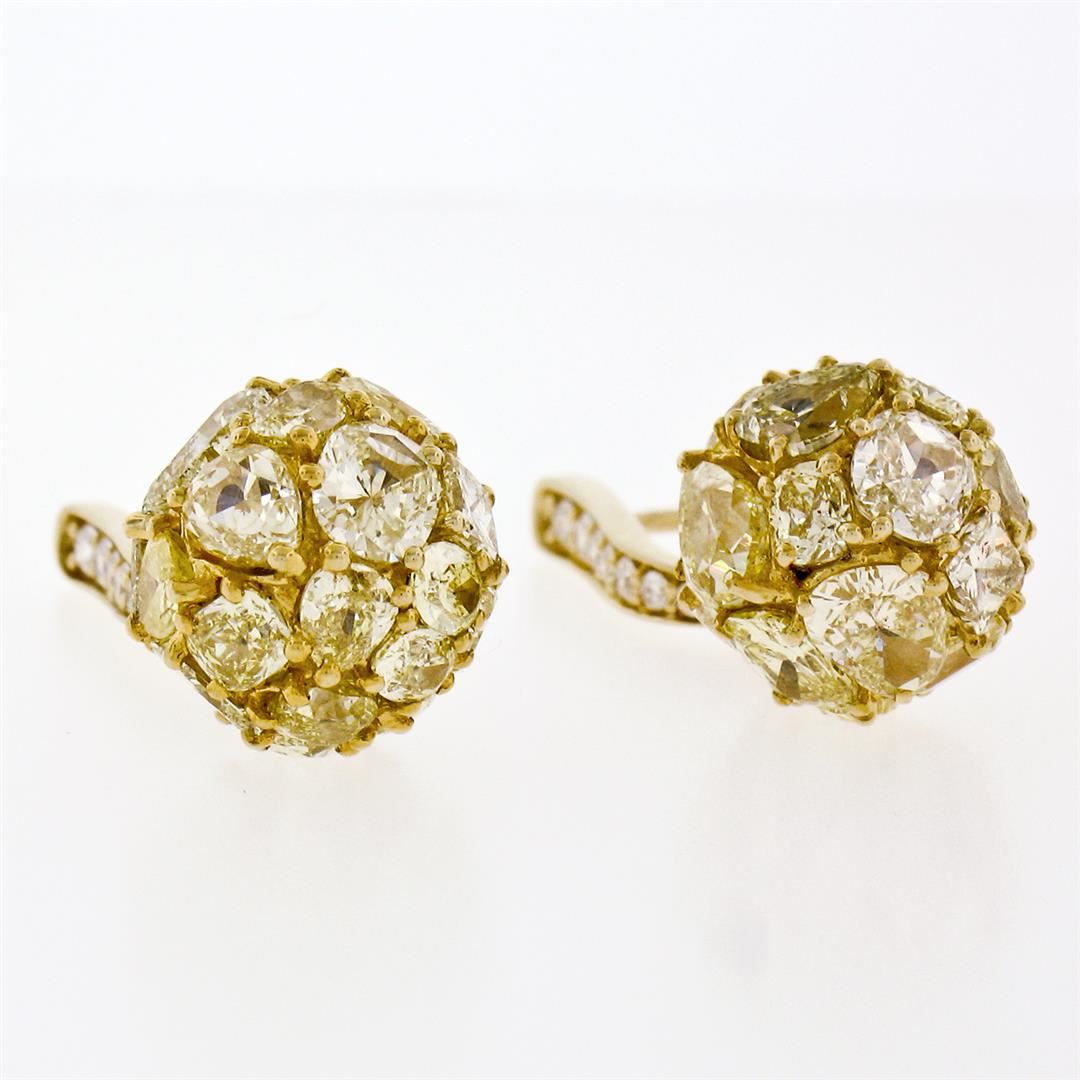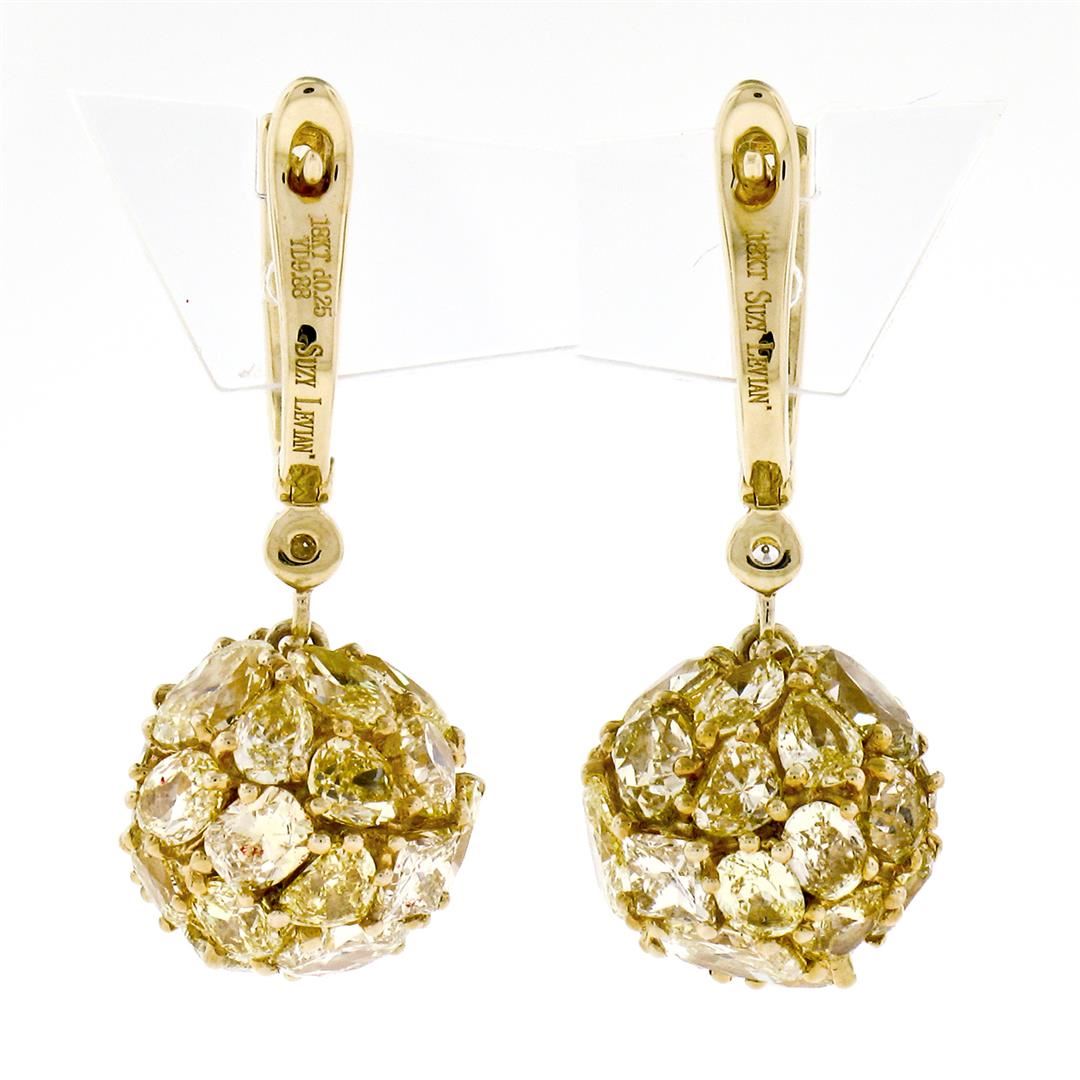 One Suzy Levian 10.13ctw Fancy Intense Yellow & Brilliant Diamond Drop Ball Earrings. Item Details - Material: 18K Yellow Gold, Weight: 9.38 Grams, Stone(s): (16) Natural Genuine Diamonds - Round Brilliant Cut - Pave and Bezel Set - E Color - VS1 Clarity - 0.25ctw (exact - stamped), (46) Natural Genuine Diamonds - Pear, Marquise, Princess, Trillion, Oval, Cushion, and Heart Cut - Prong Set - Fancy Intense and Fancy Yellow Color - VVS2 to SI2 Clarity - 9.88ctw (exact - stamped), Total Carat Weight: 10.13 (approx.), Backing: Post Backing w/ Snap Closures (Pierced ears are required.), Ball Diameter: 11.5mm, Overall Height: 27.65mm, Signature: 18KT d0.25 YD9.88 Suzy Levian, Condition: Designer statement earrings. Like new condition and ready to wear.