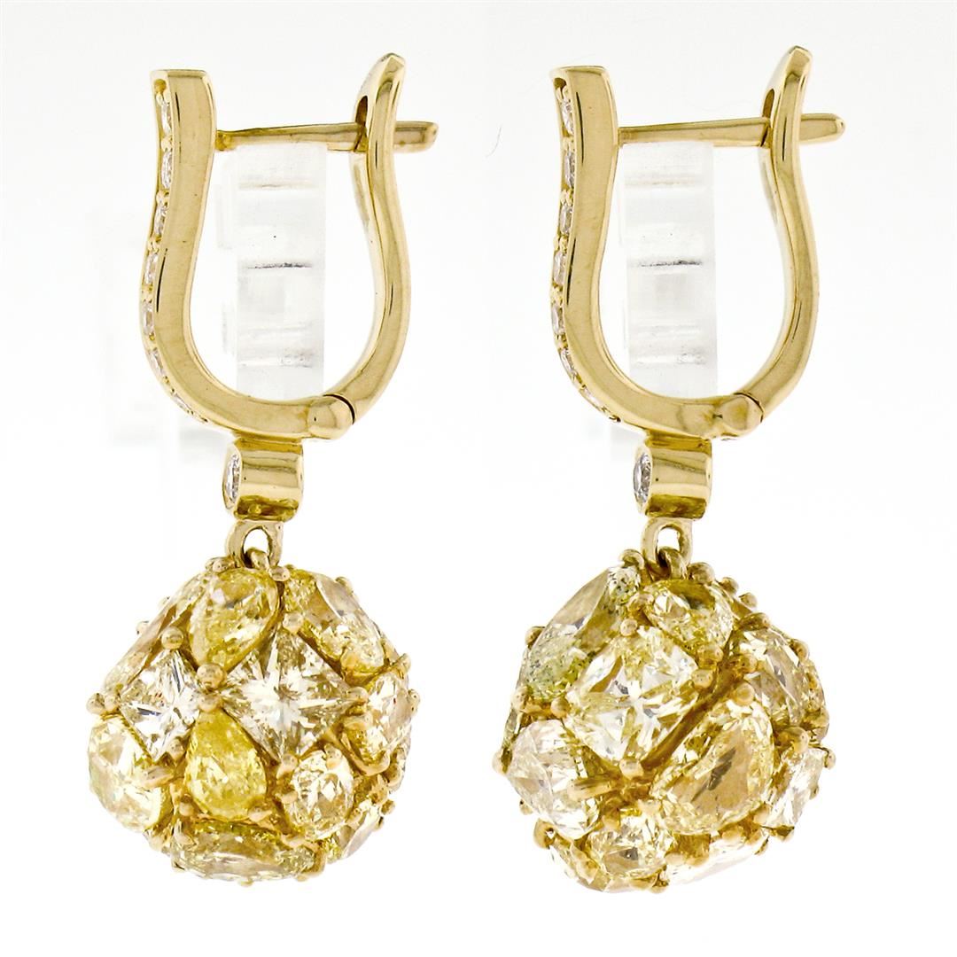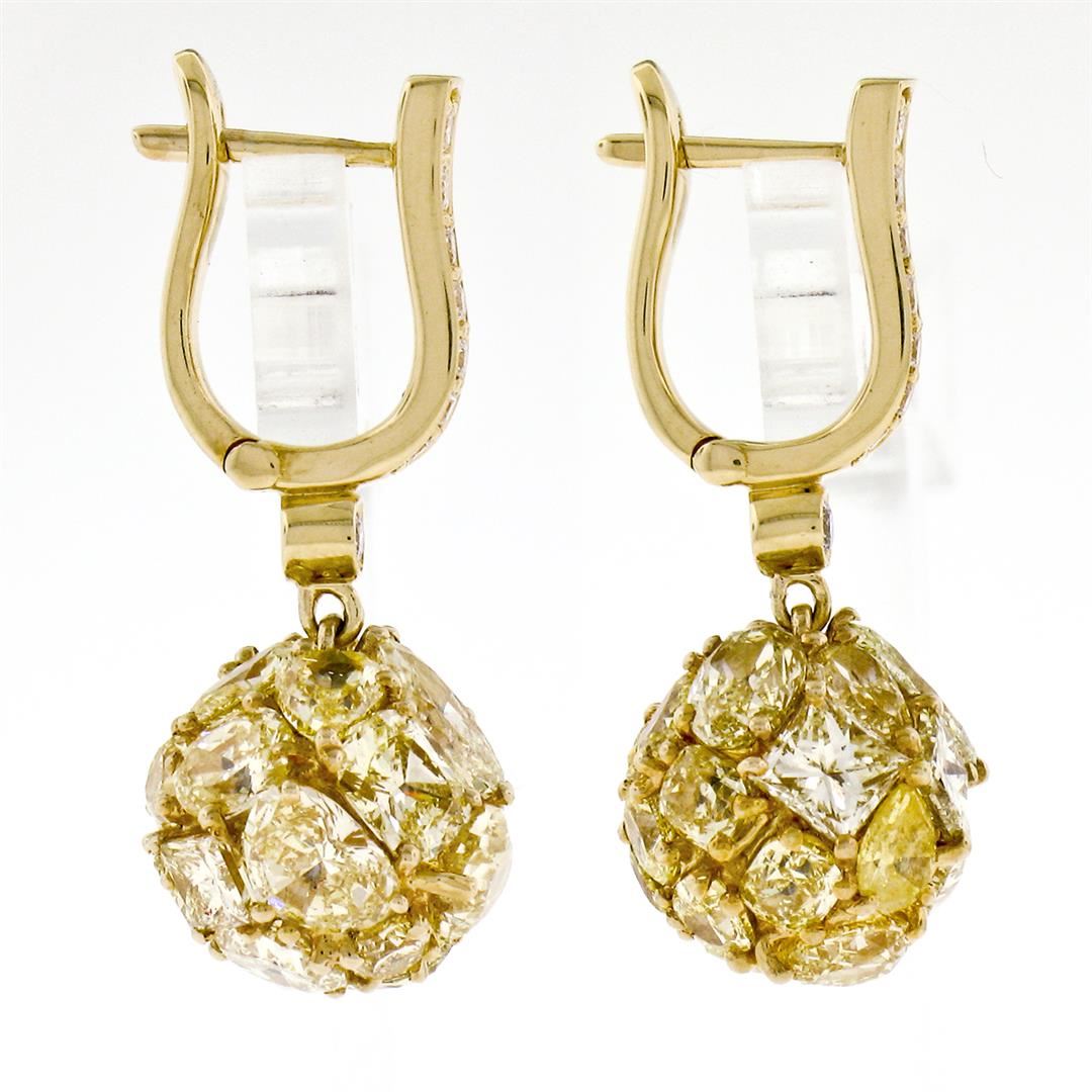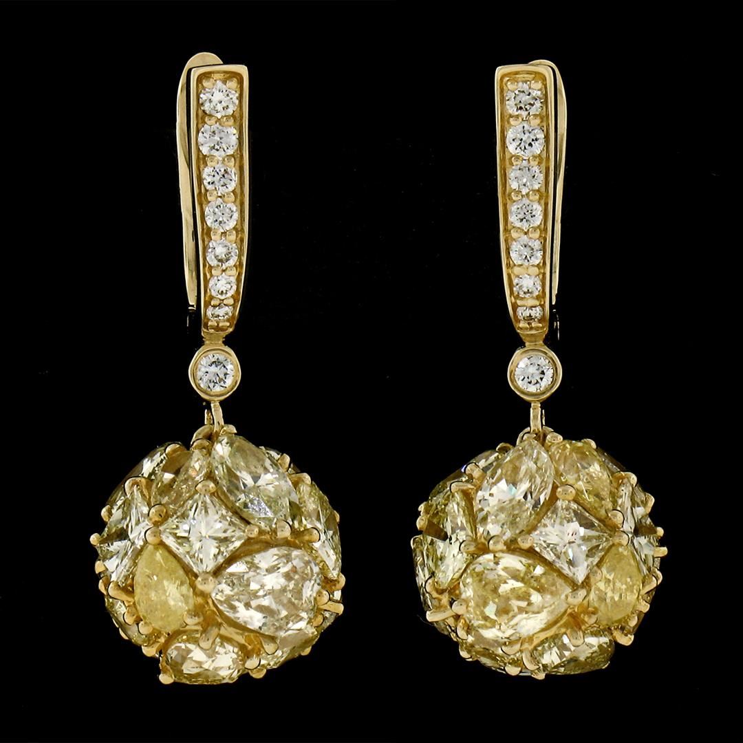 One Pair Suzy Levian 10.13ctw Fancy Intense Yellow & Brilliant Diamond Drop Ball Earrings. Item Details - Material: 18K Yellow Gold, Weight: 9.38 Grams, Stone(s): (16) Natural Genuine Diamonds - Round Brilliant Cut - Pave and Bezel Set - E Color - VS1 Clarity - 0.25ctw (exact - stamped), (46) Natural Genuine Diamonds - Pear, Marquise, Princess, Trillion, Oval, Cushion, and Heart Cut - Prong Set - Fancy Intense and Fancy Yellow Color - VVS2 to SI2 Clarity - 9.88ctw (exact - stamped), Total Carat Weight: 10.13 (approx.), Backing: Post Backing w/ Snap Closures (Pierced ears are required.), Ball Diameter: 11.5mm, Overall Height: 27.65mm, Signature: 18KT d0.25 YD9.88 Suzy Levian, Condition: Designer statement earrings. Like new condition and ready to wear.