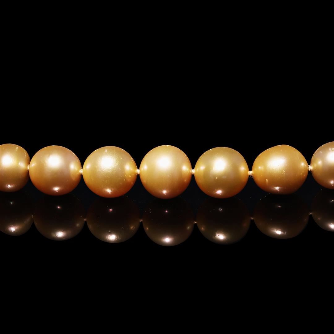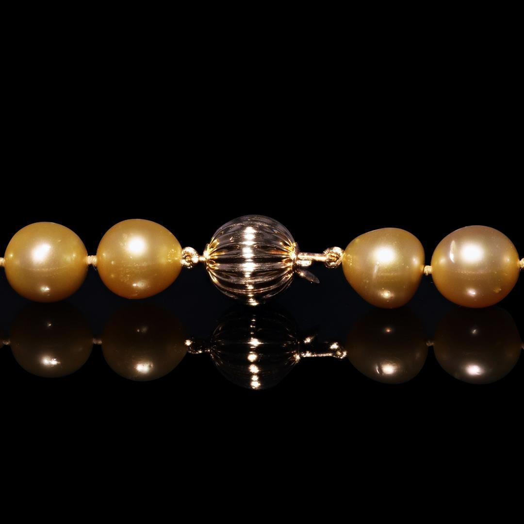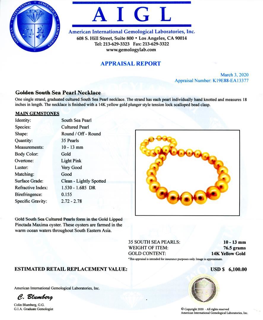 Golden South Sea Pearl Necklace One single strand, graduated cultured South Sea Pearl necklace. The strand has each pearl individually hand knotted and measures 18 inches in length. The necklace is finished with a 14K yellow gold plunger style tension lock scalloped bead clasp. MAIN GEMSTONES Identity: South Sea Pearl Species: Cultured Pearl Shape: Round / Off - Round Quantity: 35 Pearls Measurements: 10 - 13 mm Body Color: Gold Overtone: Light Pink Luster: Very Good Matching: Good Surface Grade: Clean - Lightly Spotted Refractive Index: 1.530 - 1.685 DR Birefringence: 0.155 Specific Gravity: 2.72 - 2.78 Gold South Sea Cultured Pearls form in the Gold Lipped Pinctada Maxima oyster. These oysters are farmed in the warm ocean waters throughout South Eastern Asia. 35 SOUTH SEA PEARLS: 10 - 13 mm WEIGHT OF ITEM: 76.5 grams GOLD CONTENT: 14K Yellow Gold