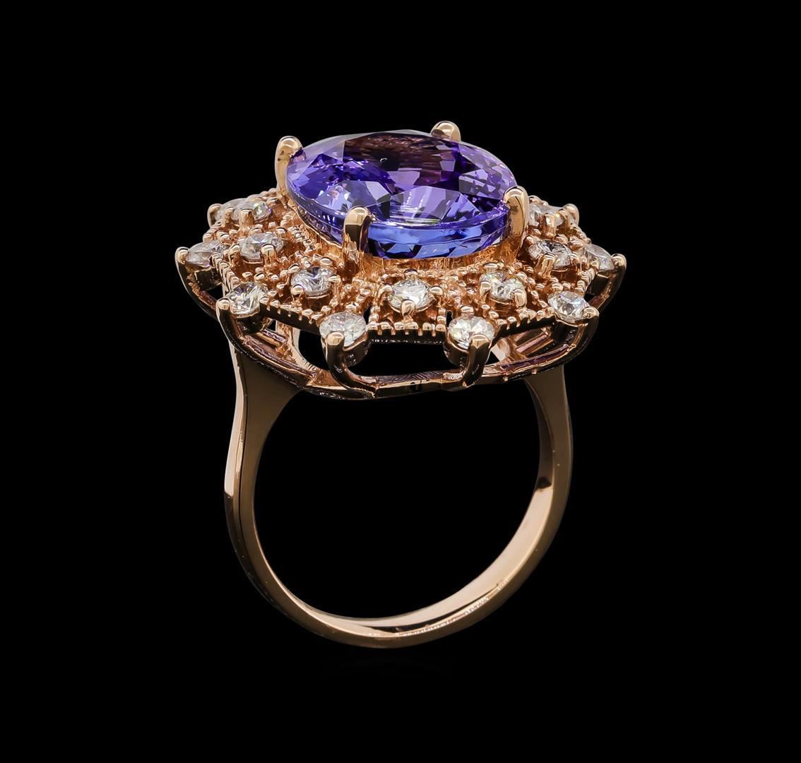 One electronically tested 14KT rose gold lady's cast fashion ring with a double basket halo with a bright polish with milgrain detailing finish. The featured lady's ring has a shank measuring 2.76 millimeters wide. Identified with markings of 'K14'. Condition is new, good workmanship. Containing: One prong set oval modified brilliant cut natural tanzanite, measuring 15.19 x 12.33 x 6.75mm, (depth est.) 15%. bulge factor, approximate weight of 10.16ct., clarity is eye clean, medium light, moderately strong, violetish blue color, (GIA vB 4/4), cut is very good. Transmitting light with no distortion, transparent. Colored gemstones are presumed to have been subjected to commonly used enhancement processes. Graded in the setting. Twenty prong set round brilliant cut diamonds, measuring 2.60 - 2.50 x 1.58mm (depth est.) approximate total weight of 20 Stones = 1.26ct. Graded in the setting. Clarity SI-1 to SI-2. Color: G - I Cut Good. Total Weight of Colored Stones 10.16ct.. Total Weight of Diamonds 1.26ct.. Total Weight of Ring 9.00gm GAS Appraised.