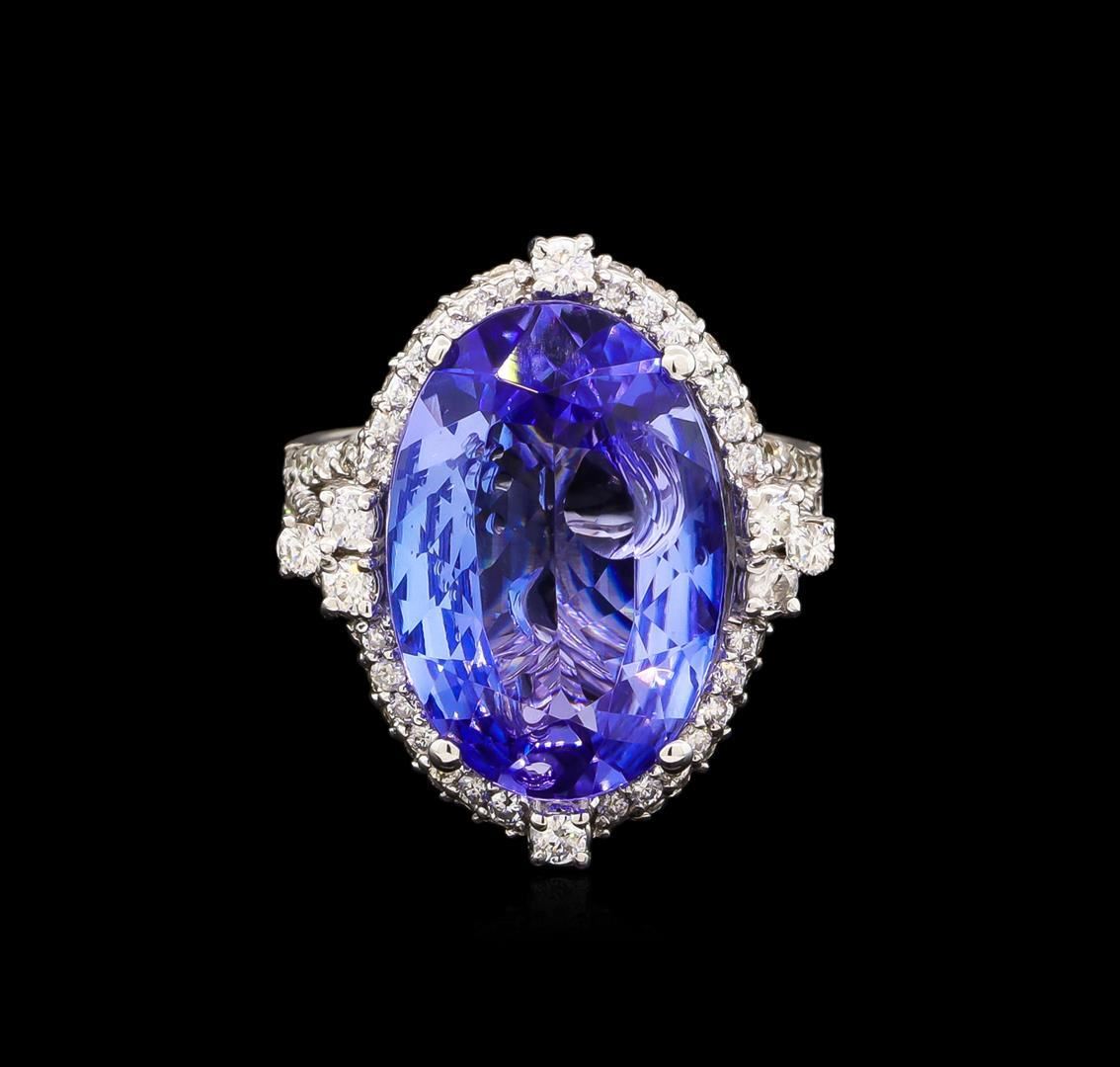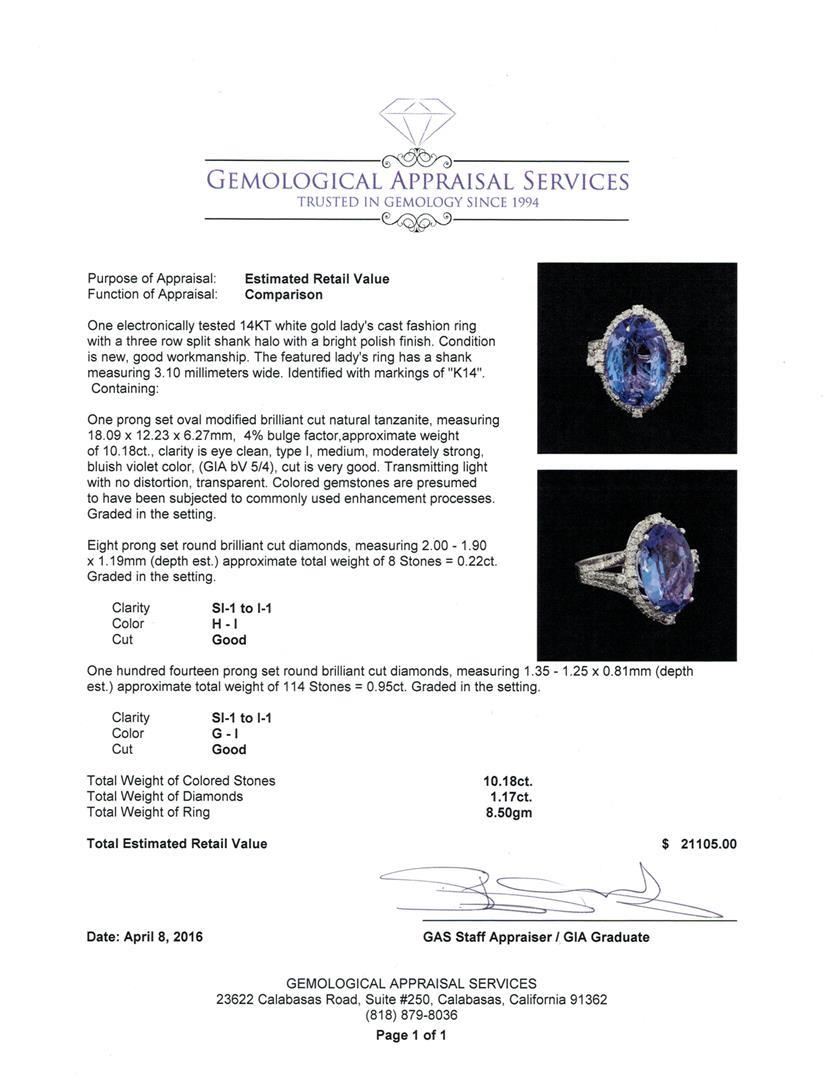 One electronically tested 14KT white gold lady's cast fashion ring with a three row split shank halo with a bright polish finish. The featured lady's ring has a shank measuring 3.10 millimeters wide. Identified with markings of "K14". Condition is new, good workmanship. Containing: One prong set oval modified brilliant cut natural tanzanite, measuring 18.09 x 12.23 x 6.27mm, 4%. bulge factor, approximate weight of 10.18ct., clarity is eye clean, type I, medium, moderately strong, bluish violet color, (GIA bV 5/4), cut is very good. Transmitting light with no distortion, transparent. Colored gemstones are presumed to have been subjected to commonly used enhancement processes. Graded in the setting. Eight prong set round brilliant cut diamonds, measuring 2.00 - 1.90 x 1.19mm (depth est.) approximate total weight of 8 Stones = 0.22ct. Graded in the setting. Clarity: SI-1 to I-1. Color: H - I. Cut Good One Hundred Fourteen prong set round brilliant cut diamonds, measuring 1.35 - 1.25 x 0.81mm (depth est.) approximate total weight of 114 Stones = 0.95ct. Graded in the setting. Clarity: SI-1 to I-1. Color: G - I. Cut Good. Total Weight of Colored Stones 10.18ct. Total Weight of Diamonds 1.17ct. Total Weight of Ring 8.50gm. GAS Appraised.