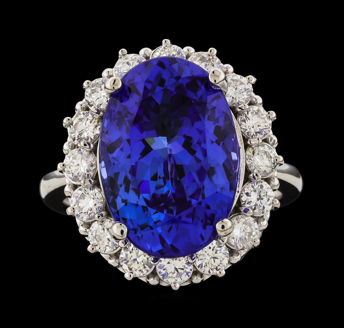One electronically tested 14KT white gold lady's cast fashion ring with a basket halo with a bright polish finish. The featured lady's ring has a shank measuring 2.60 millimeters wide. Identified with markings of 'K14'. Condition is new, good workmanship. Containing: One prong set oval modified brilliant cut natural tanzanite, measuring 16.07 x 11.00 x 8.22mm, (depth est.) approximate weight of 10.35ct., clarity is eye clean, medium dark, moderately strong, violetish blue color, (GIA vB 6/4), cut is very good. Transmitting light with no distortion, transparent. Colored gemstones are presumed to have been subjected to commonly used enhancement processes. Graded in the setting. Sixteen prong set round brilliant cut diamonds, measuring 2.80 - 2.70 x 1.65mm (depth est.) approximate total weight of 16 Stones = 1.22ct. Graded in the setting. Clarity SI-1 to SI-3. Color: H - I Cut Good. Total Weight of Colored Stones 10.35ct.. Total Weight of Diamonds 1.22ct.. Total Weight of Ring 7.90gm. GAS Appraised at $19,495.00.