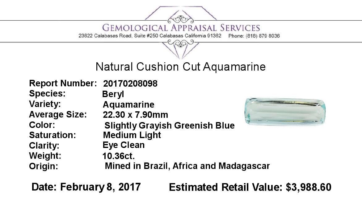 One natural cushion cut aquamarine with an exact weight of 10.36ct., clarity is eye clean, slightly grayish greenish blue, medium light. Gemological Appraisals Services estimates the retail value at $3988.6 GAS Appraised.
