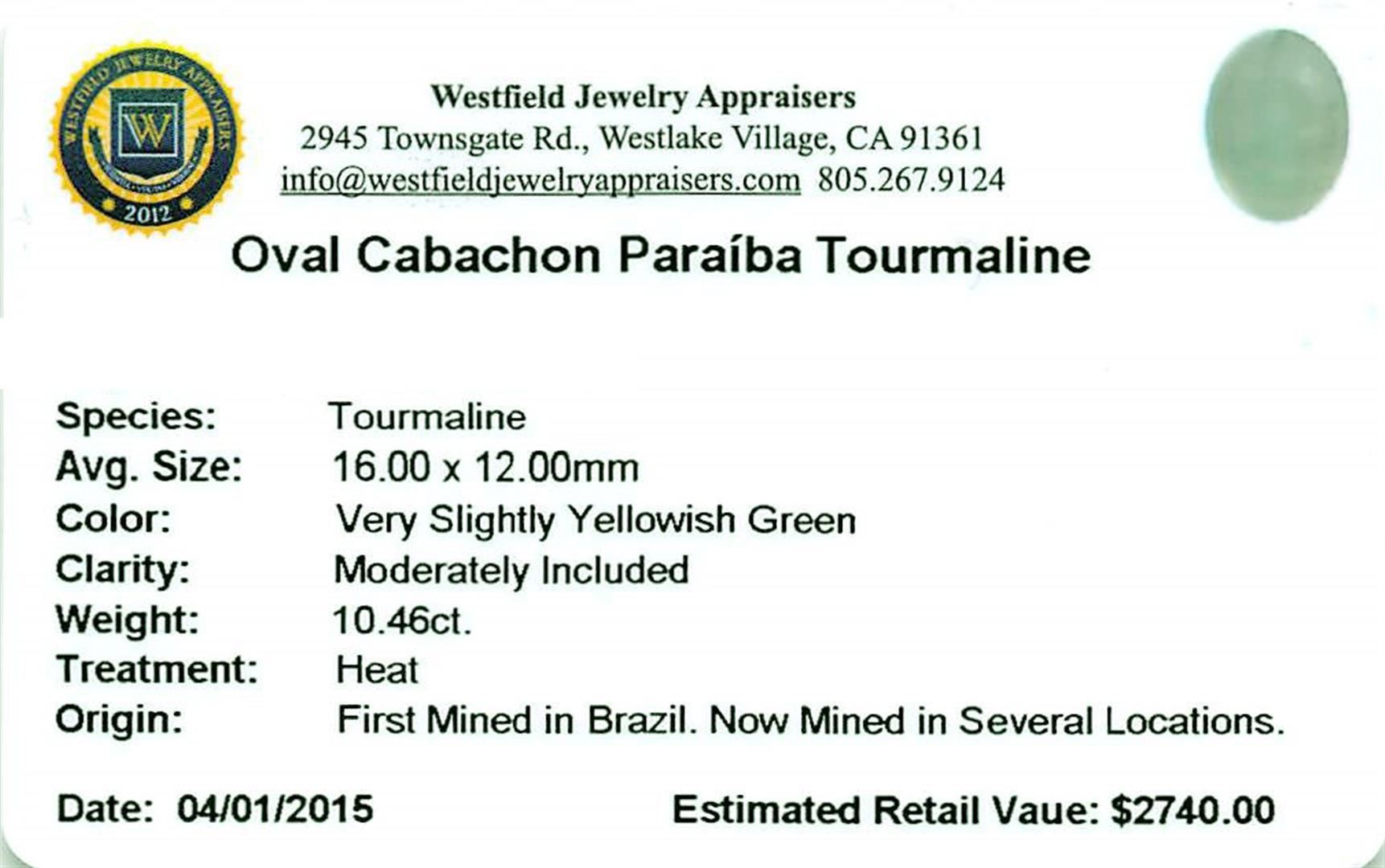 _x000D_One oval cabochon cut natural Paraiba tourmaline exact weight 10.46ct., clarity is moderately included, cut is good. Westfield Appraised.
