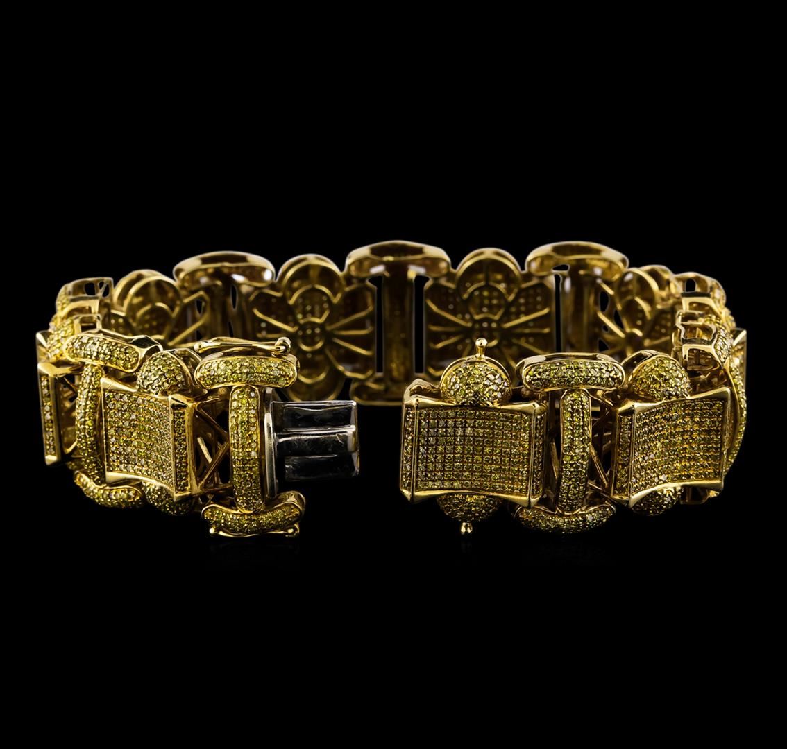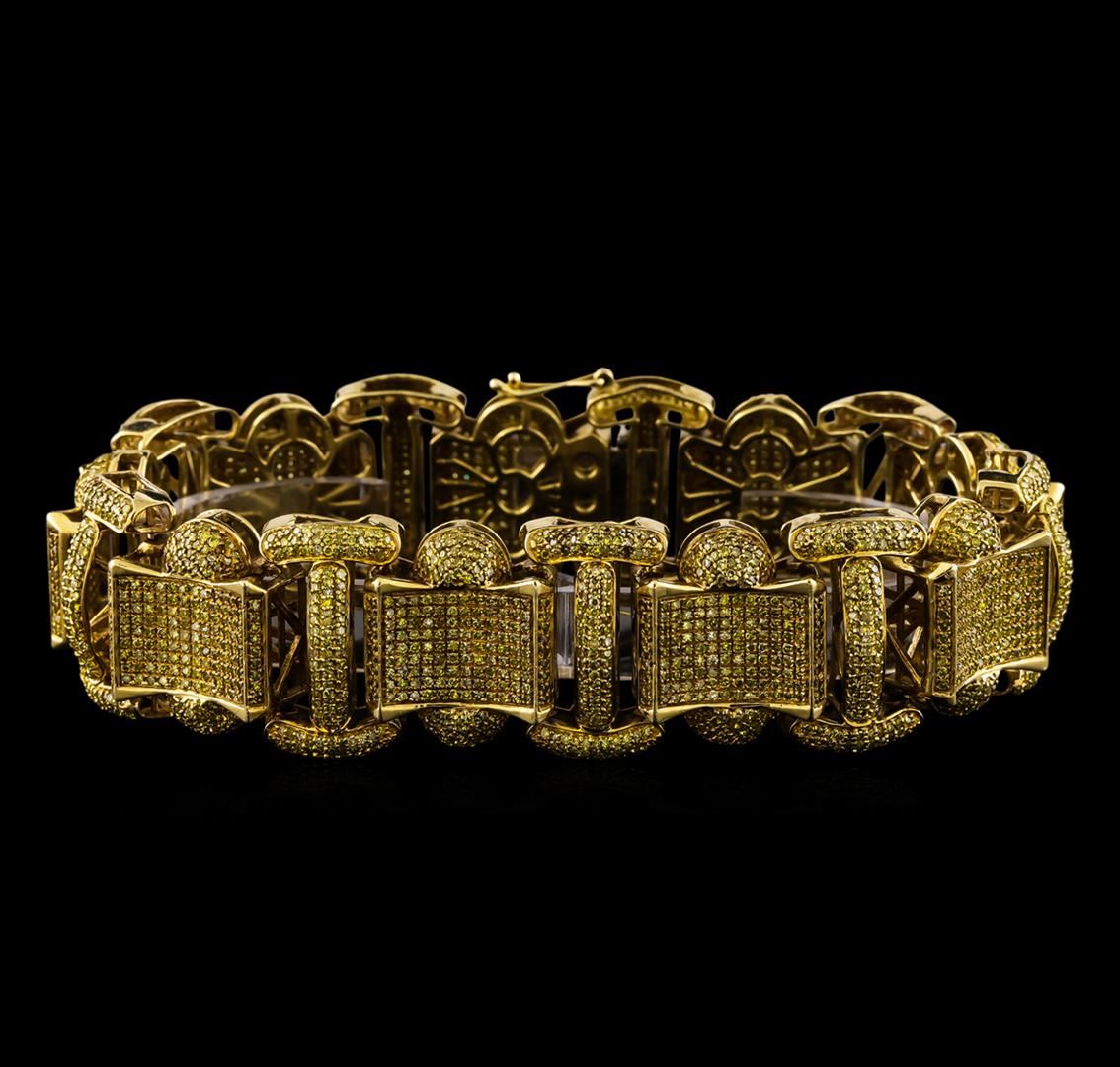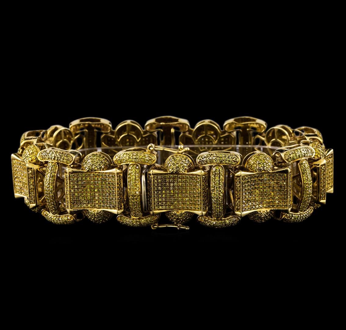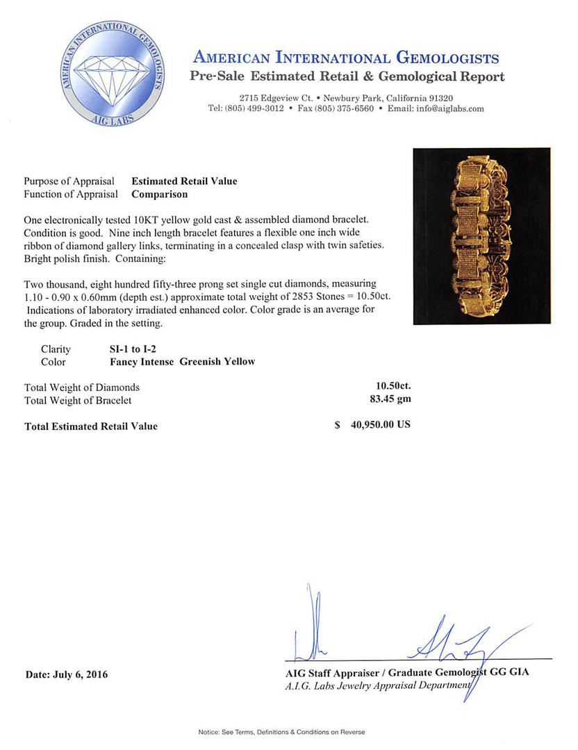 One electronically tested 10KT yellow gold cast & assembled diamond bracelet. Nine inch length bracelet features a flexible one inch wide ribbon of diamond gallery links, terminating in a concealed clasp with twin safeties. Bright polish finish. Condition is good. Containing: Two Thousand, Eight Hundred Fifty-Three prong set single cut diamonds, measuring 1.10 - 0.90 x 0.60mm (depth est.) approximate total weight of 2853 Stones = 10.50ct. Indications of laboratory irradiated enhanced color. Color grade is an average for the group. Graded in the setting. Clarity: SI-1 to I-2. Total Weight of Diamonds 10.50ct. Total Weight of Bracelet 83.45gm. AIG Appraised at $40,950.00.