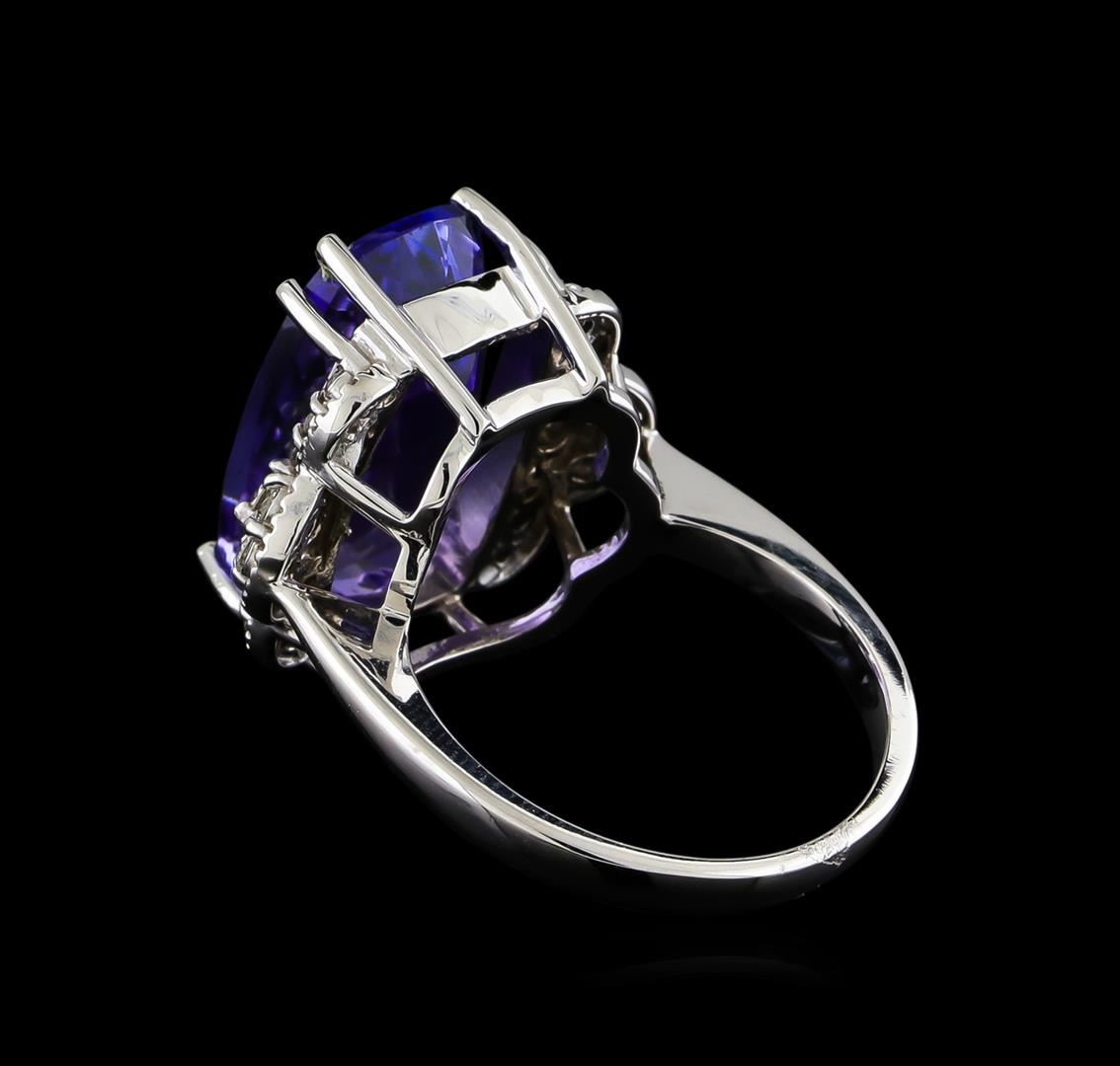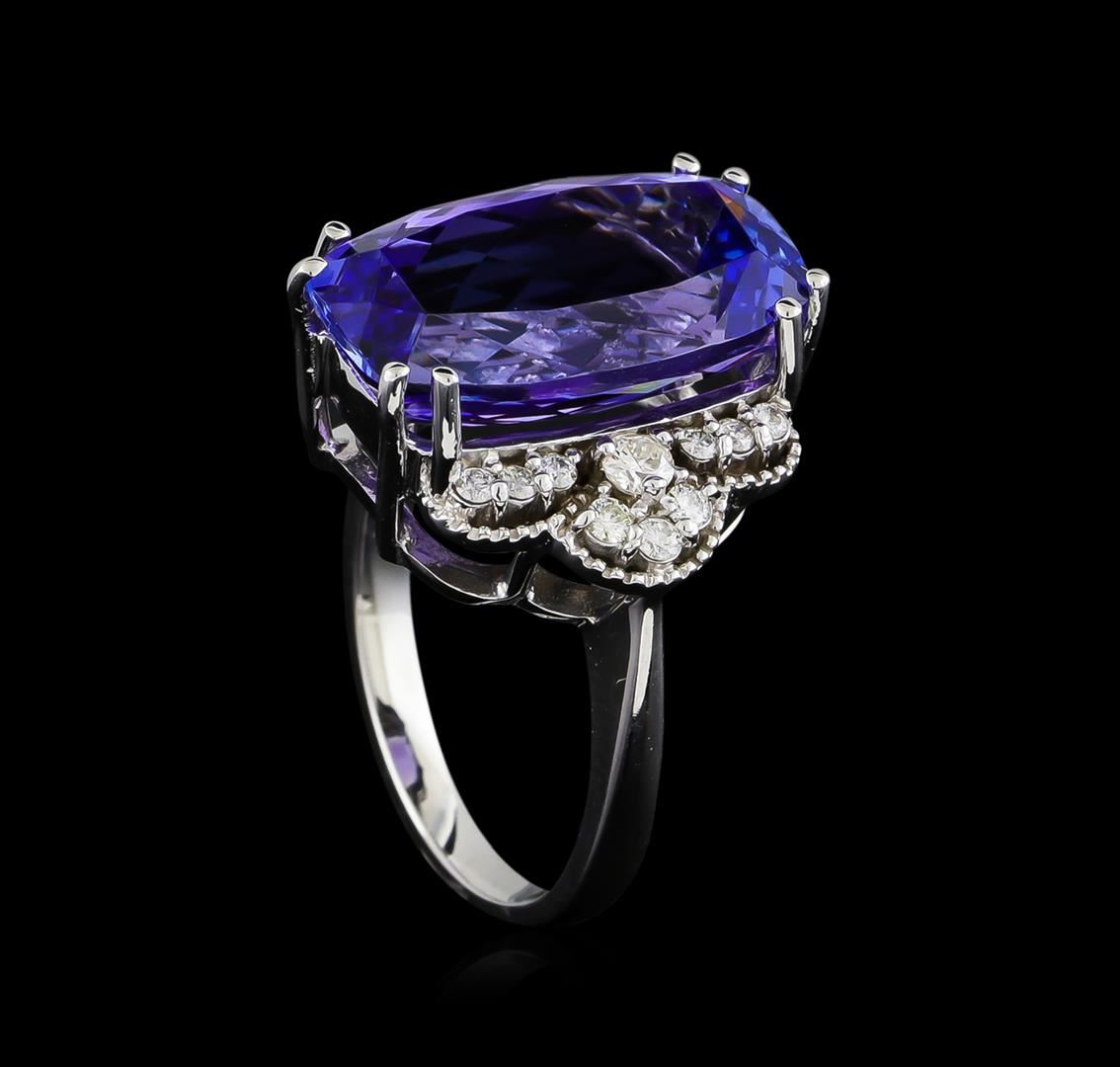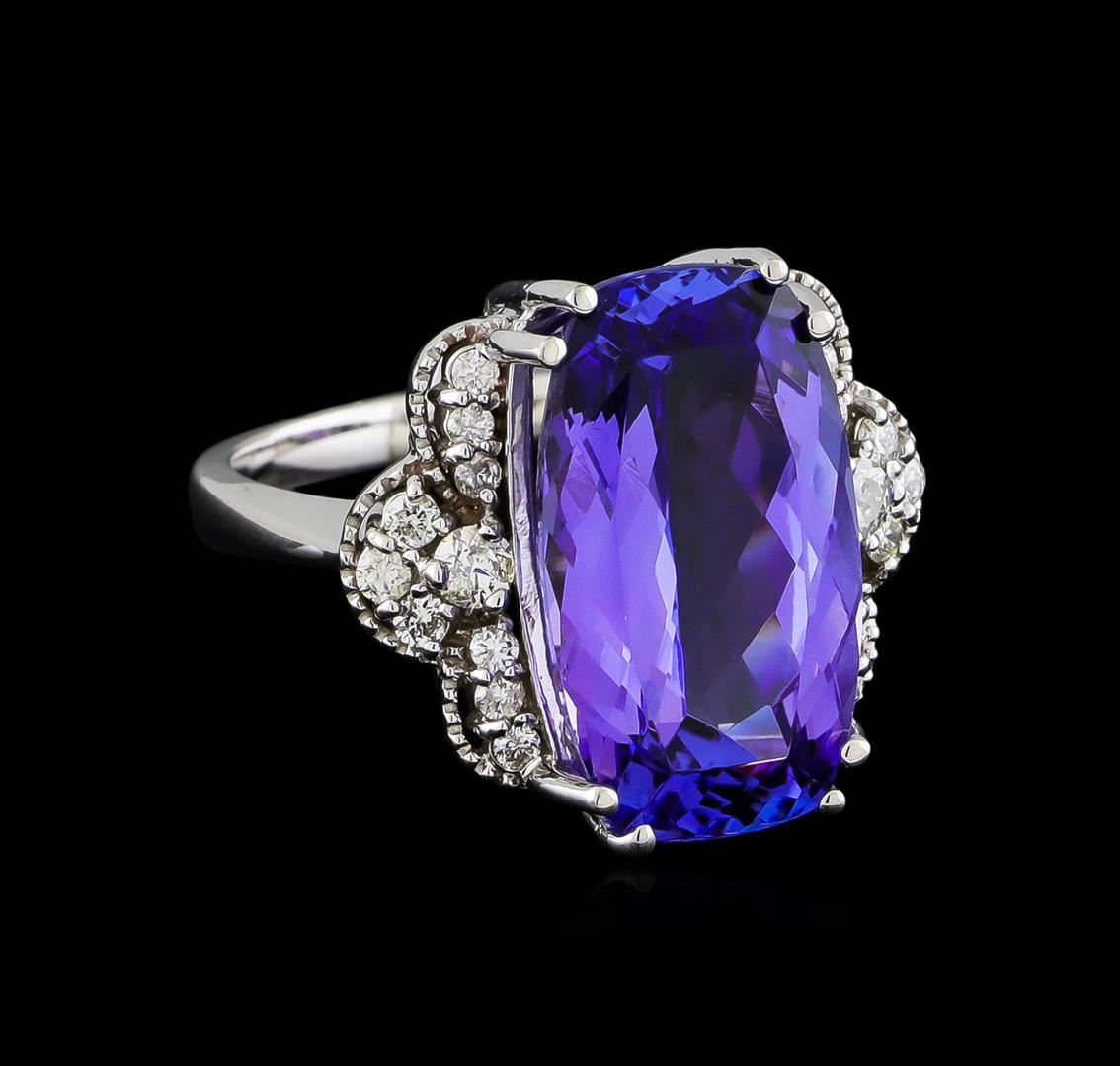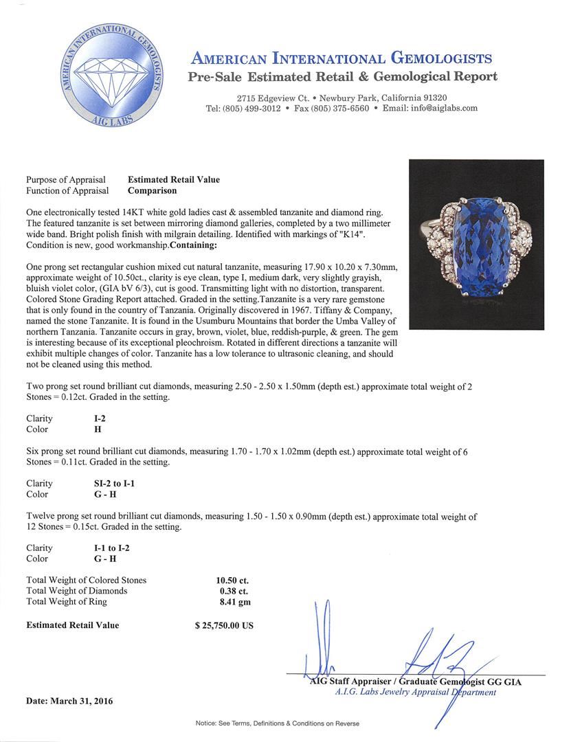 One electronically tested 14KT white gold ladies cast & assembled tanzanite and diamond ring. The featured tanzanite is set between mirroring diamond galleries, completed by a two millimeter wide band. Bright polish finish with milgrain detailing. Identified with markings of "K14". Condition is new, good workmanship. Containing: One prong set rectangular cushion mixed cut natural tanzanite, measuring 17.90 x 10.20 x 7.30mm, approximate weight of 10.50ct., clarity is eye clean, type I, medium dark, very slightly grayish, bluish violet color, (GIA bV 6/3), cut is good. Transmitting light with no distortion, transparent. Colored Stone Grading Report attached. Graded in the setting. Tanzanite is a very rare gemstone that is only found in the country of Tanzania. Originally discovered in 1967. Tiffany & Company, named the stone Tanzanite. It is found in the Usumburu Mountains that border the Umba Valley of northern Tanzania. Tanzanite occurs in gray, brown, violet, blue, reddish-purple, & green. The gem is interesting because of its exceptional pleochroism. Rotated in different directions a tanzanite will exhibit multiple changes of color. Tanzanite has a low tolerance to ultrasonic cleaning, and should not be cleaned using this method. Two prong set round brilliant cut diamonds, measuring 2.50 - 2.50 x 1.50mm (depth est.) approximate total weight of 2 Stones = 0.12ct. Graded in the setting. Clarity: I-2. Color: H Six prong set round brilliant cut diamonds, measuring 1.70 - 1.70 x 1.02mm (depth est.) approximate total weight of 6 Stones = 0.11ct. Graded in the setting. Clarity: SI-2 to I-1. Color: G - H Twelve prong set round brilliant cut diamonds, measuring 1.50 - 1.50 x 0.90mm (depth est.) approximate total weight of 12 Stones = 0.15ct. Graded in the setting. Clarity: I-1 to I-2. Color: G - H. Total Weight of Colored Stones 10.50ct. Total Weight of Diamonds 0.38ct. Total Weight of Ring 8.41gm. AIG Appraised at $25,750.00.
