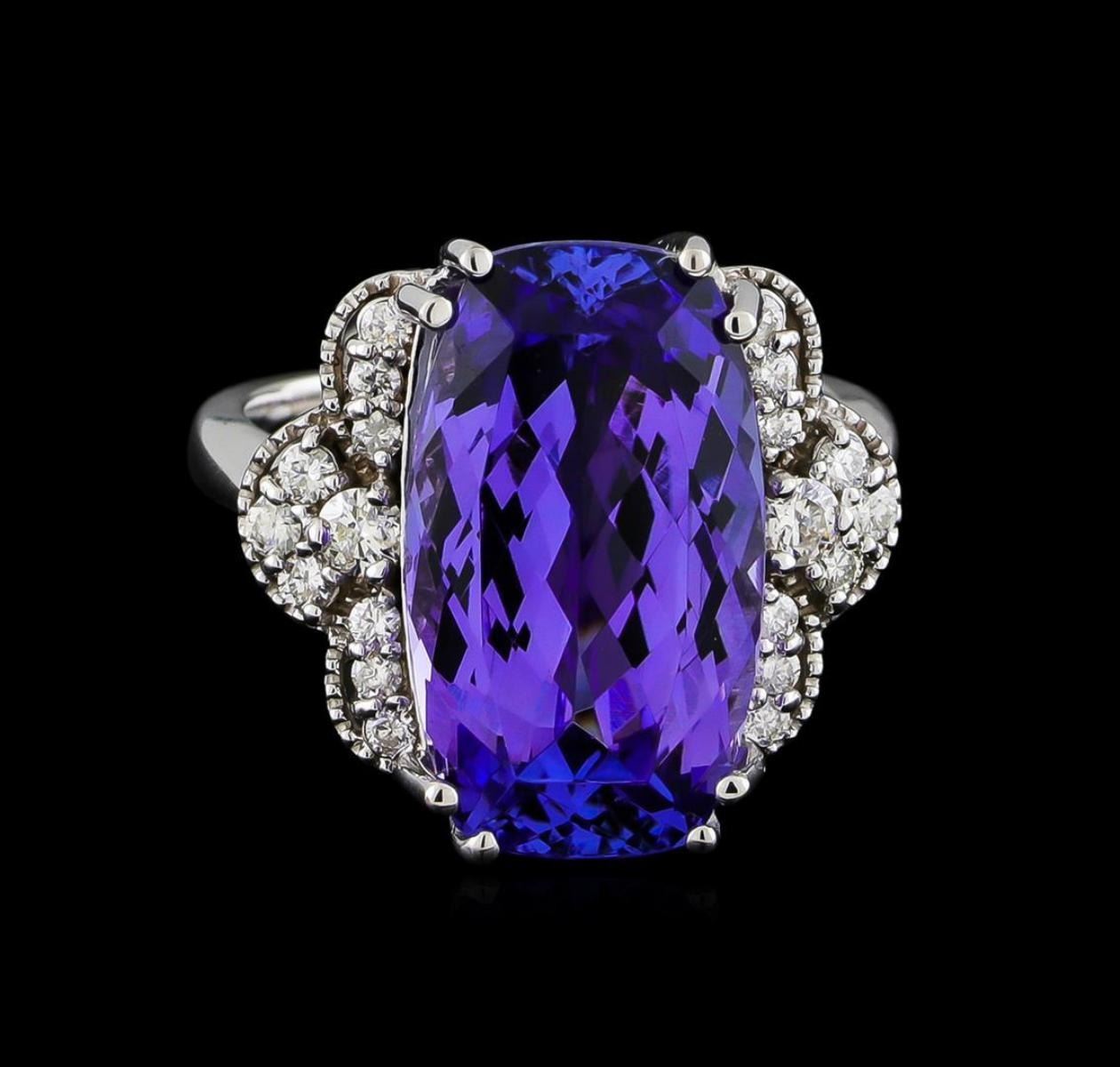 One electronically tested 14KT white gold ladies cast & assembled tanzanite and diamond ring. The featured tanzanite is set between mirroring diamond galleries, completed by a two millimeter wide band. Bright polish finish with milgrain detailing. Identified with markings of "K14". Condition is new, good workmanship. Containing: One prong set rectangular cushion mixed cut natural tanzanite, measuring 17.90 x 10.20 x 7.30mm, approximate weight of 10.50ct., clarity is eye clean, type I, medium dark, very slightly grayish, bluish violet color, (GIA bV 6/3), cut is good. Transmitting light with no distortion, transparent. Colored Stone Grading Report attached. Graded in the setting. Tanzanite is a very rare gemstone that is only found in the country of Tanzania. Originally discovered in 1967. Tiffany & Company, named the stone Tanzanite. It is found in the Usumburu Mountains that border the Umba Valley of northern Tanzania. Tanzanite occurs in gray, brown, violet, blue, reddish-purple, & green. The gem is interesting because of its exceptional pleochroism. Rotated in different directions a tanzanite will exhibit multiple changes of color. Tanzanite has a low tolerance to ultrasonic cleaning, and should not be cleaned using this method. Two prong set round brilliant cut diamonds, measuring 2.50 - 2.50 x 1.50mm (depth est.) approximate total weight of 2 Stones = 0.12ct. Graded in the setting. Clarity: I-2. Color: H Six prong set round brilliant cut diamonds, measuring 1.70 - 1.70 x 1.02mm (depth est.) approximate total weight of 6 Stones = 0.11ct. Graded in the setting. Clarity: SI-2 to I-1. Color: G - H Twelve prong set round brilliant cut diamonds, measuring 1.50 - 1.50 x 0.90mm (depth est.) approximate total weight of 12 Stones = 0.15ct. Graded in the setting. Clarity: I-1 to I-2. Color: G - H. Total Weight of Colored Stones 10.50ct. Total Weight of Diamonds 0.38ct. Total Weight of Ring 8.41gm. AIG Appraised.