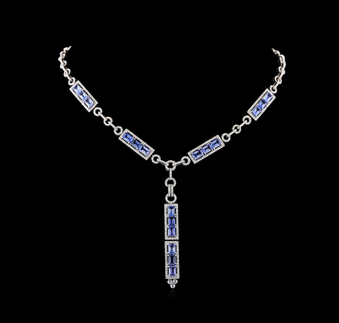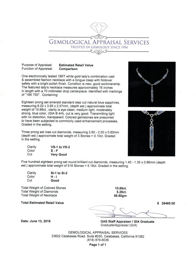 One electronically tested 18KT white gold lady's combination cast & assembled fashion necklace with a tongue clasp with foldover safety with a bright polish finish. The featured lady's necklace measures approximately 16 inches in length with a 70 millimeter drop centerpiece. Identified with markings of "18K 750". Condition is new, good workmanship. Containing: Eighteen prong set emerald standard step cut natural blue sapphires, measuring 6.02 x 3.95 x 2.57mm, (depth est.) approximate total weight of 10.66ct., clarity is eye clean, medium light, moderately strong, blue color, (GIA B 4/4), cut is very good. Transmitting light with no distortion, transparent. Colored gemstones are presumed to have been subjected to commonly used enhancement processes. Graded in the setting. Three prong set rose cut diamonds, measuring 2.60 - 2.50 x 0.80mm (depth est.) approximate total weight of 3 Stones = 0.10ct. Graded in the setting. Clarity: VS-1 to VS-2. Color: E - F. Cut Very Good Five Hundred Eighteen prong set round brilliant cut diamonds, measuring 1.40 - 1.35 x 0.86mm (depth est.) approximate total weight of 518 Stones = 5.18ct. Graded in the setting. Clarity: SI-1 to SI-2. Color: H - I. Cut Good. Total Weight of Colored Stones 10.66ct. Total Weight of Diamonds 5.28ct. Total Weight of Necklace 56.80gm. GAS Appraised.