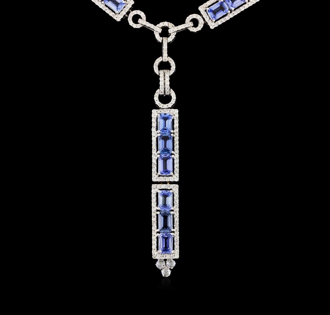 One electronically tested 18KT white gold lady's combination cast & assembled fashion necklace with a tongue clasp with foldover safety with a bright polish finish. The featured lady's necklace measures approximately 16 inches in length with a 70 millimeter drop centerpiece. Identified with markings of "18K 750". Condition is new, good workmanship. Containing: Eighteen prong set emerald standard step cut natural blue sapphires, measuring 6.02 x 3.95 x 2.57mm, (depth est.) approximate total weight of 10.66ct., clarity is eye clean, medium light, moderately strong, blue color, (GIA B 4/4), cut is very good. Transmitting light with no distortion, transparent. Colored gemstones are presumed to have been subjected to commonly used enhancement processes. Graded in the setting. Three prong set rose cut diamonds, measuring 2.60 - 2.50 x 0.80mm (depth est.) approximate total weight of 3 Stones = 0.10ct. Graded in the setting. Clarity: VS-1 to VS-2. Color: E - F. Cut Very Good Five Hundred Eighteen prong set round brilliant cut diamonds, measuring 1.40 - 1.35 x 0.86mm (depth est.) approximate total weight of 518 Stones = 5.18ct. Graded in the setting. Clarity: SI-1 to SI-2. Color: H - I. Cut Good. Total Weight of Colored Stones 10.66ct. Total Weight of Diamonds 5.28ct. Total Weight of Necklace 56.80gm. GAS Appraised.