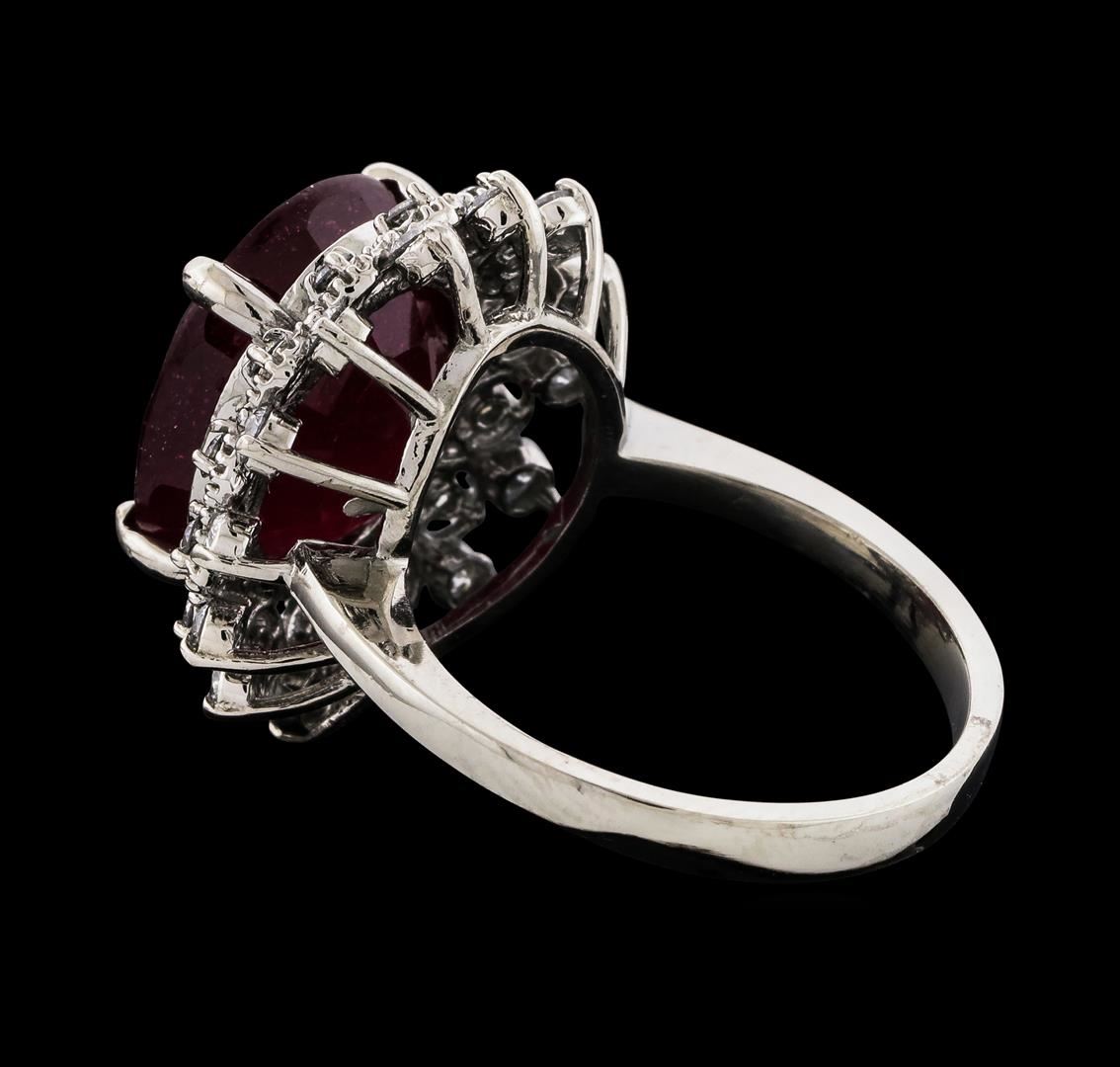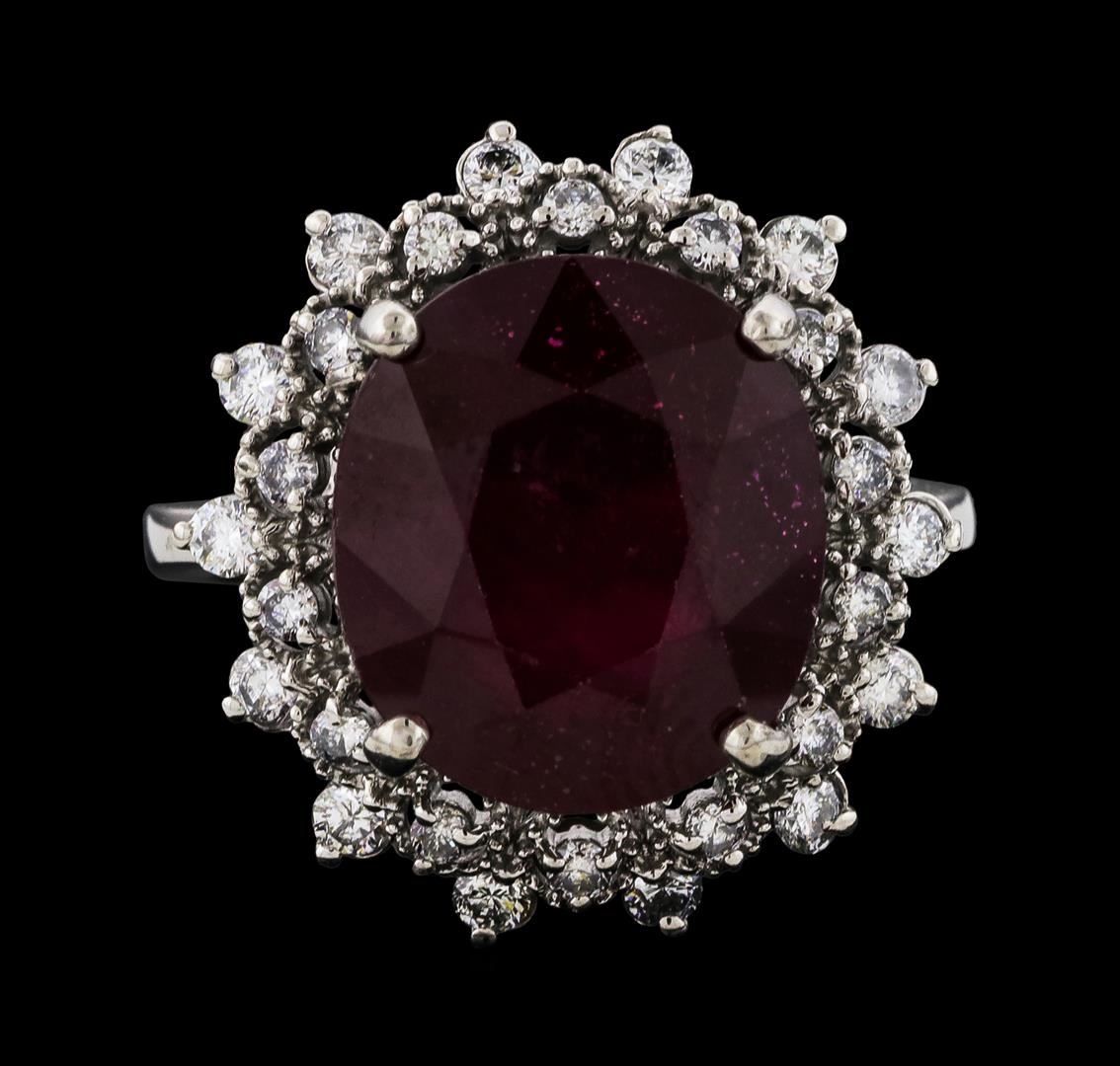 One Ruby and Diamond Ring featuring: 14KT White Gold with a total weight of 4.77 grams, Ruby with a total weight of 10.75ct, and 28 Diamonds with a total weight of 0.58ctw.
