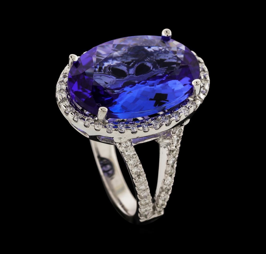 One electronically tested 14KT white gold lady's cast fashion ring with a split cathedral shank with a halo with a bright polish finish. The featured lady's ring has a shank measuring 2.73 millimeters wide. Identified with markings of '14K'. Condition is new, good workmanship. Containing: One prong set oval modified brilliant cut natural tanzanite, measuring 17.55 x 12.71 x 6.40mm, (depth est.) 8%. bulge factor, approximate weight of 10.86ct., clarity is eye clean, medium light, moderately strong, violetish blue color, (GIA vB 4/4), cut is very good. Transmitting light with no distortion, transparent. Colored gemstones are presumed to have been subjected to commonly used enhancement processes. Graded in the setting. Seventy-Six prong set round brilliant cut diamonds, measuring 1.40 - 1.35 x 0.86mm (depth est.) approximate total weight of 76 Stones = 0.76ct. Graded in the setting. Clarity SI-1 to SI-2. Color: G - H Cut Good. Total Weight of Colored Stones 10.86ct.. Total Weight of Diamonds 0.76ct.. Total Weight of Ring 9.10gm. GAS Appraised.