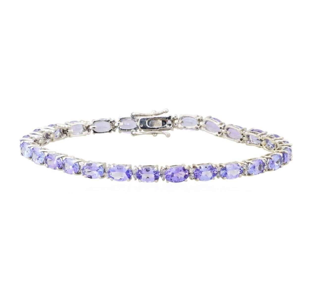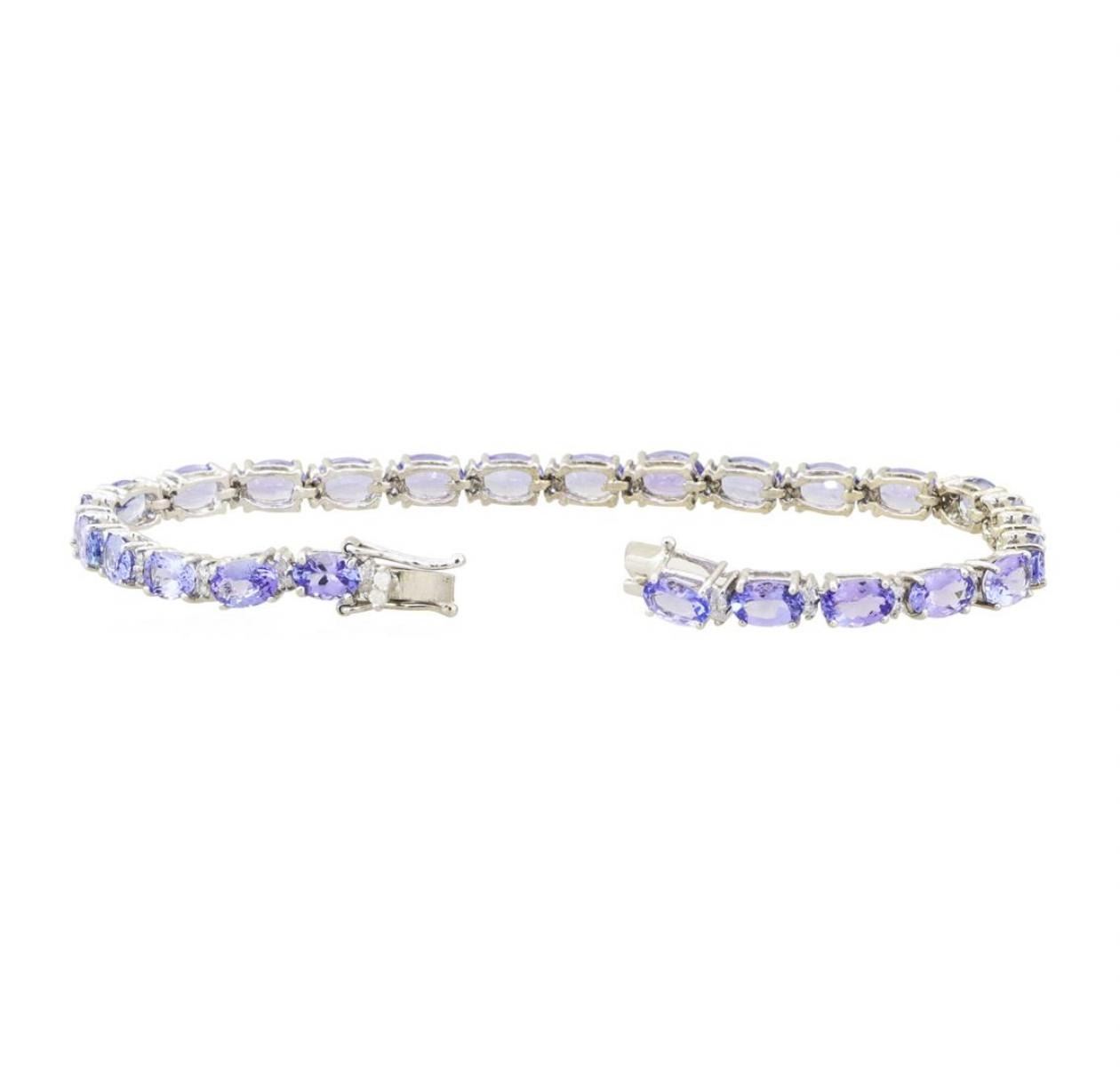One electronically tested 14KT white gold cast & assembled tanzanite & diamond bracelet. The seven inch length bracelet features a ribbon of oval sapphires, alternating with diamond duos, completed by a concealed clasp, with twin safeties. Condition is good. Containing: Twenty-six prong set oval mixed cut natural tanzanites, measuring 6.00 x 4.00 x 2.48mm, approximate total weight of 10.92ct., clarity is slightly included, type I, medium dark, slightly grayish, bluish violet color, (GIA bV 6/2), cut is good. Transmitting light with no distortion, transparent. Naturally occurring internal & external characteristics are present. Measurements are an average for the group. Graded in the setting.Tanzanite is a very rare gemstone that is only found in the country of Tanzania. Originally discovered in 1967. Tiffany & Company, named the stone Tanzanite. It is found in the Usumburu Mountains that border the Umba Valley of northern Tanzania. Tanzanite occurs in gray, brown, violet, blue, reddish-purple, & green. The gem is interesting because of its exceptional pleochroism. Rotated in different directions a tanzanite will exhibit multiple changes of color. Tanzanite has a low tolerance to ultrasonic cleaning, and should not be cleaned using this method. Fifty-Four prong set round brilliant cut diamonds, measuring 1.40 - 1.30 x 0.83mm (depth est.) approximate total weight of 54 Stones = 0.53ct. Graded in the setting. Clarity SI-2 to I-2 Color F - H Total Weight of Colored Stones 10.92 ct. Total Weight of Diamonds 0.53 ct. Total Weight of Bracelet 9.30 gm Estimated Retail Value $ 6,850.00 US